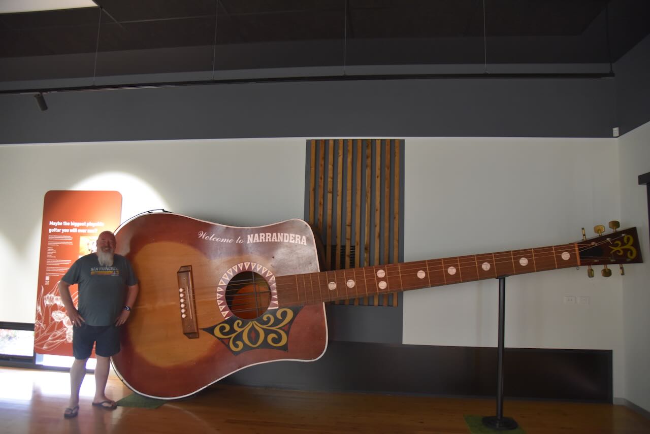 But the main reason for our visit was to see the ‘Big Guitar.’ It was built in 1988 by Robert Palmer, a Narrandera local, to help promote the Country Music Club of Narrandera. No, not the English singer and songwriter, but another Robert Palmer. The guitar measures 5.820 metres by 2.019 metres and took more than 300 hours to complete. Until the year 2000, it held the record as the largest playable guitar in the world. (Visitnsw.com 2015)