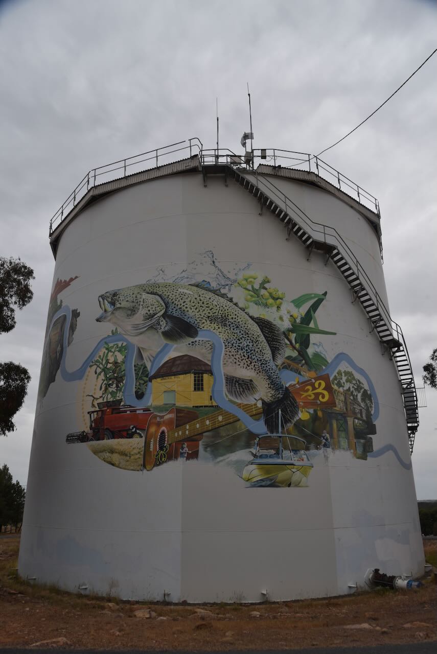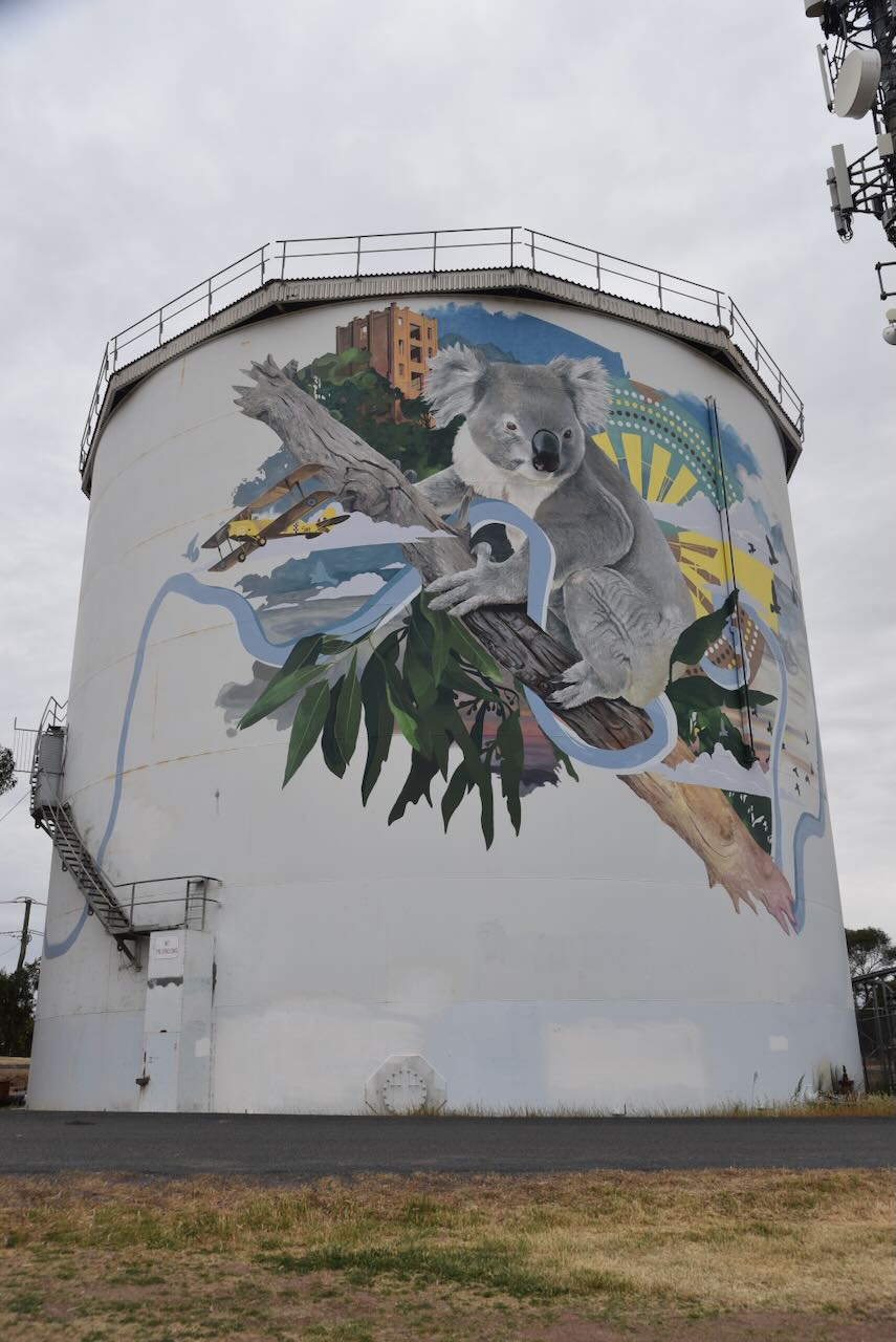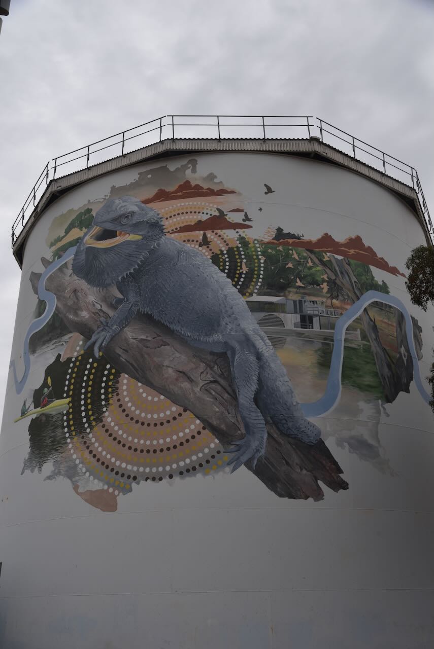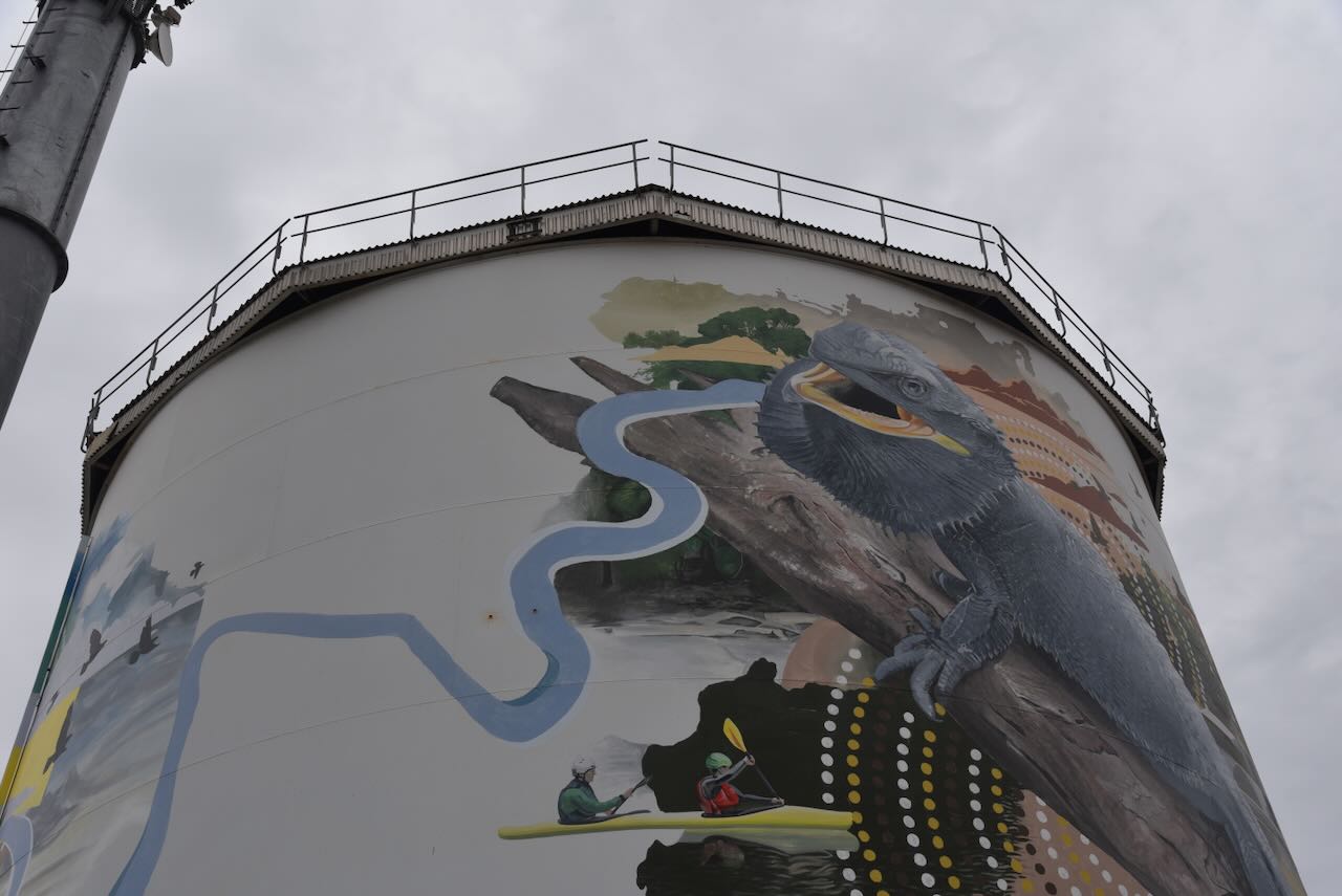 The water tower features the region’s natural beauty including koalas, banksias, an Eastern Bearded Dragon and a Murray Cod. They also feature the Tiger Moth, a paddle steamer, and the old Oakbank brewery.