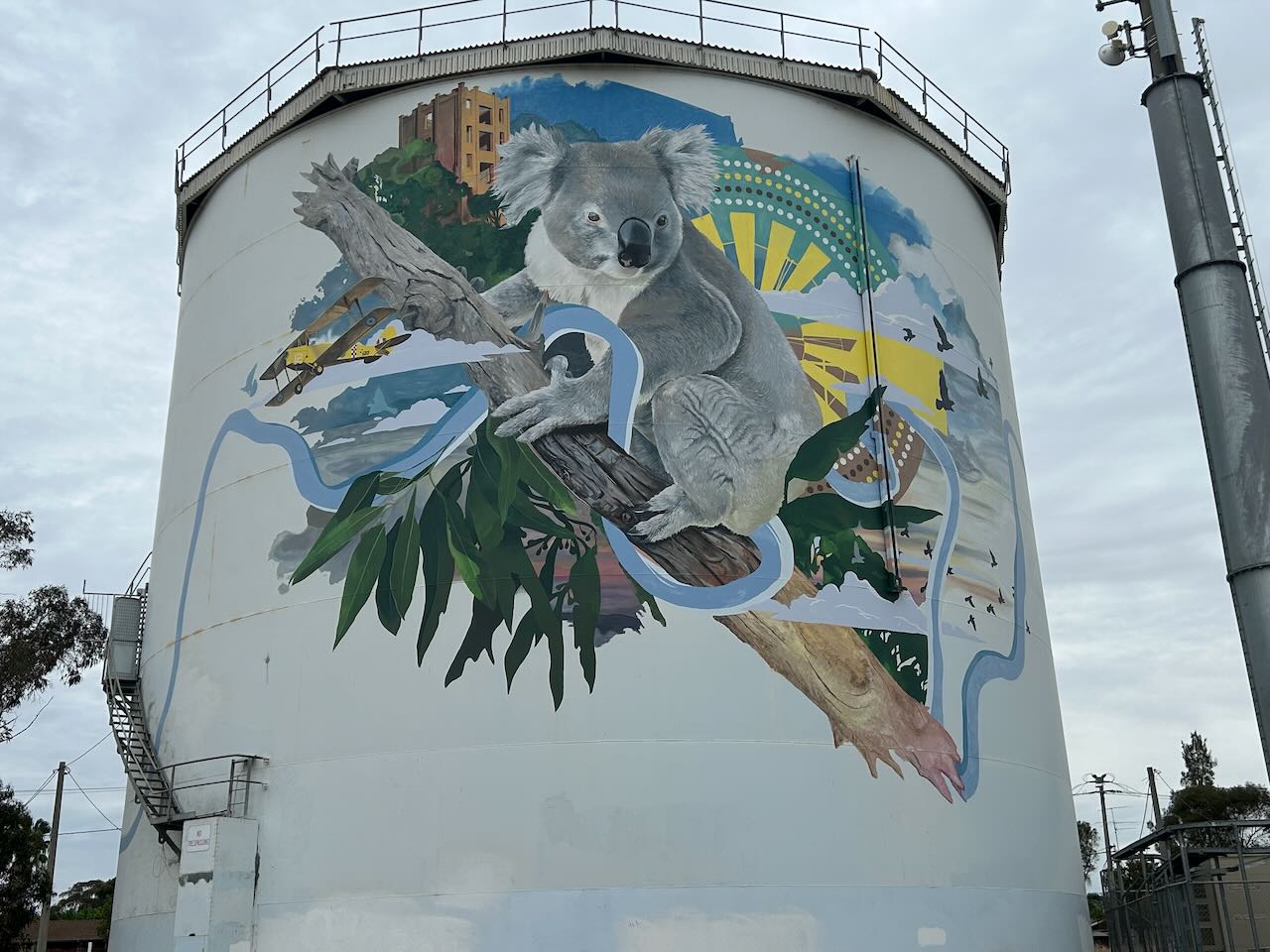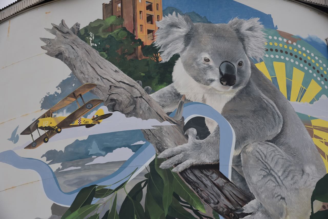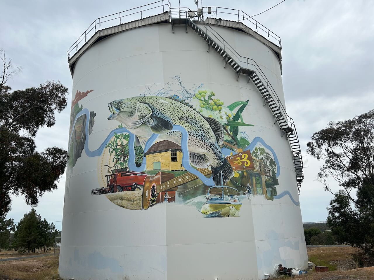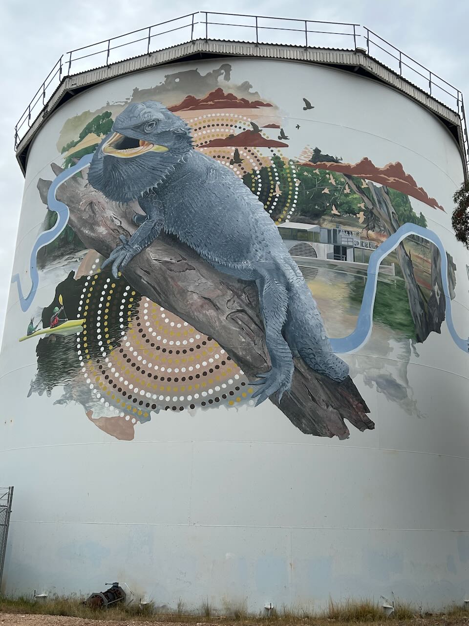 The water tower features the region’s natural beauty including koalas, banksias, an Eastern Bearded Dragon and a Murray Cod. They also feature the Tiger Moth, a paddle steamer, and the old Oakbank brewery.
