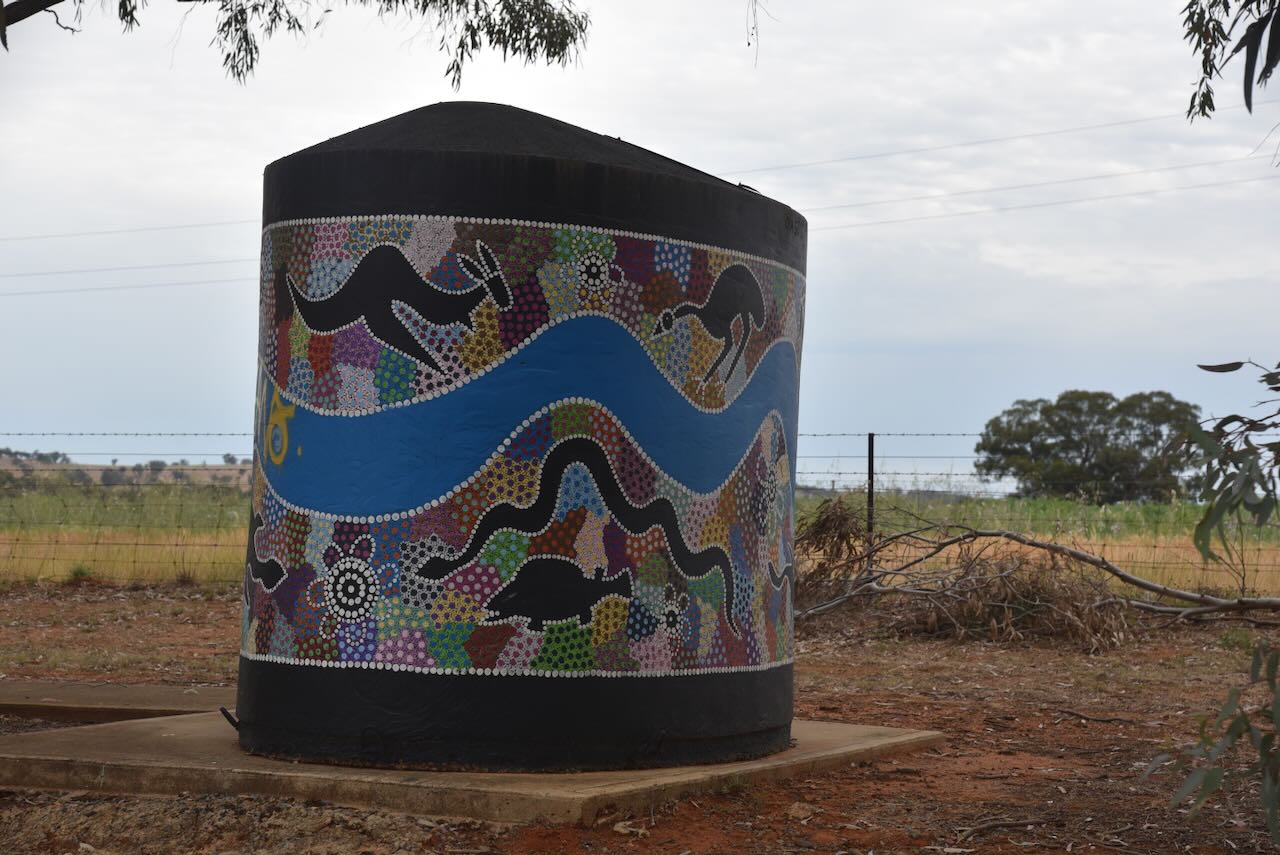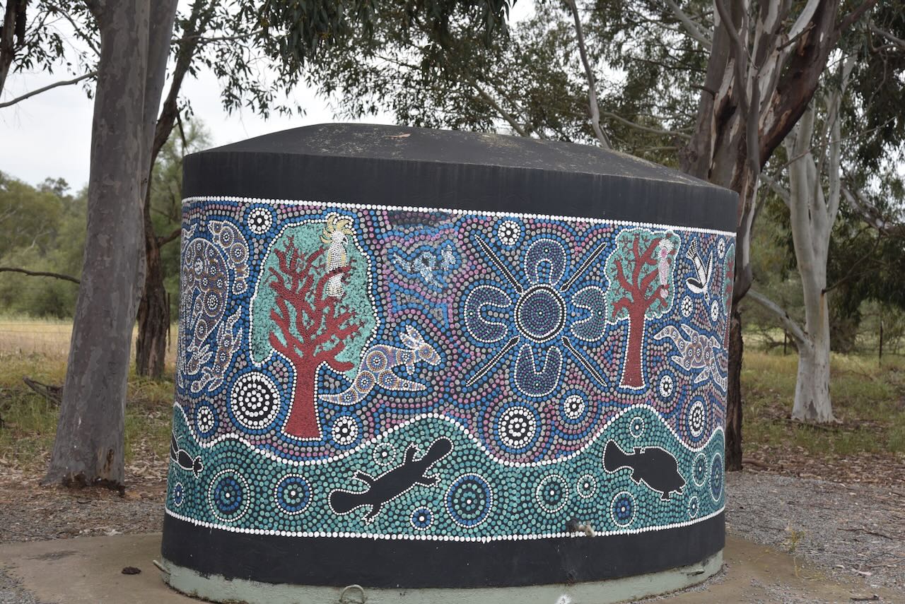 After packing up at the park, we drove towards Wagga Wagga. We stopped briefly to have a look at the Colingullie Water Tank Art. They are located on the Sturt Highway in a truck parking bay 3km on the Wagga Wagga side of Colingullie. The tanks were painted in May 2019 by Wiradjuri Aboriginal artist Owen Lyons. (Australiansiloarttrail.com, 2022)