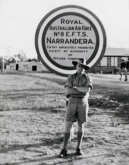 Above: Leading Aircraftman Eliot Barnfather in front of the sign of the flying school at Narrandera. Image c/o WIkipedia