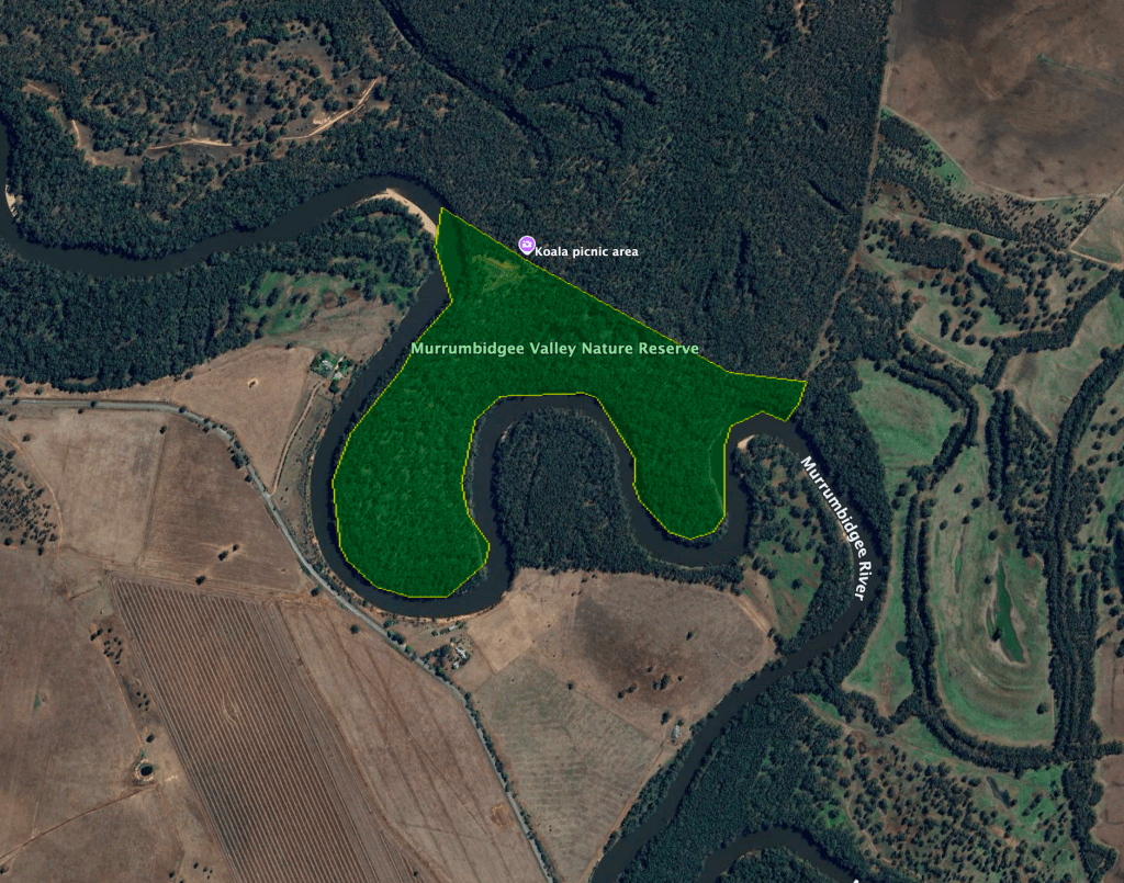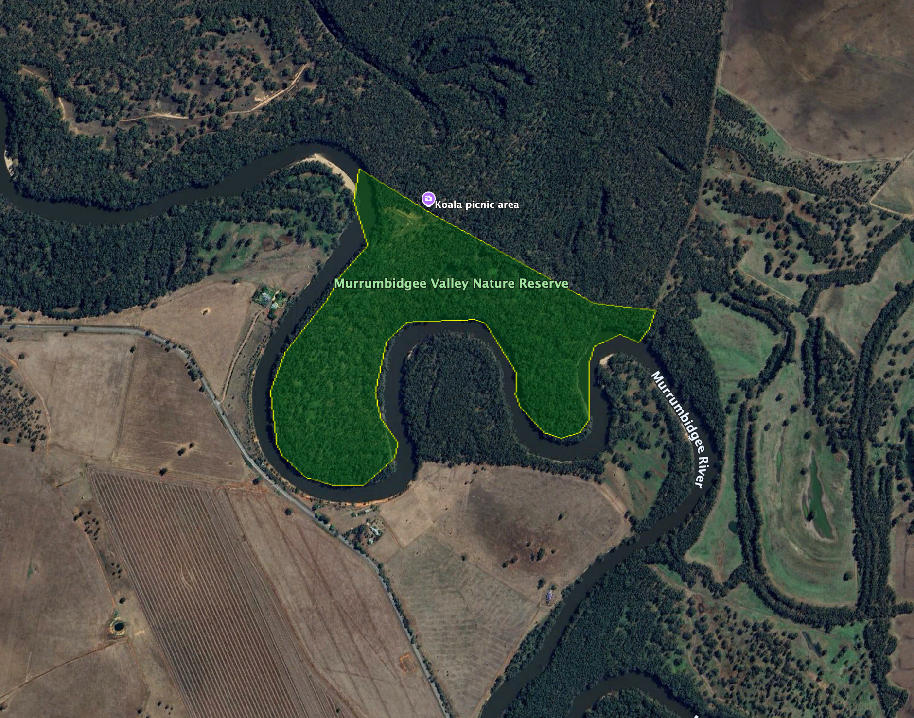 Above: the boundaries of the Murrumbidgee Valley Nature Reserve. Image c/o Google Earth