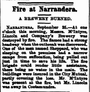 On Tuesday, the 25th day of September 1894, the brewery was destroyed by fire. An employee by the name of Sheppard, who was sleeping on the premises, had to be pulled to safety. (Trove 2025)