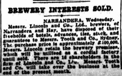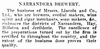 In 1888, the brewery was purchased by William Jones and Thomas Lincoln. They closed the Oakbank brewery and renamed the Narrandera brewery to the Oakbank Brewery. (Facebook 2016)