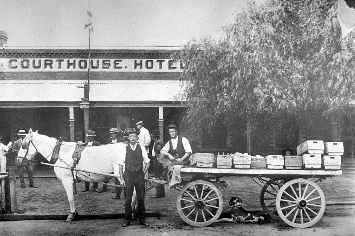Above: Horsedrawn wagon with cordial from Oakbank Brewery, outside hotel – Jerilderie, NSW. Image c/o State Library NSW