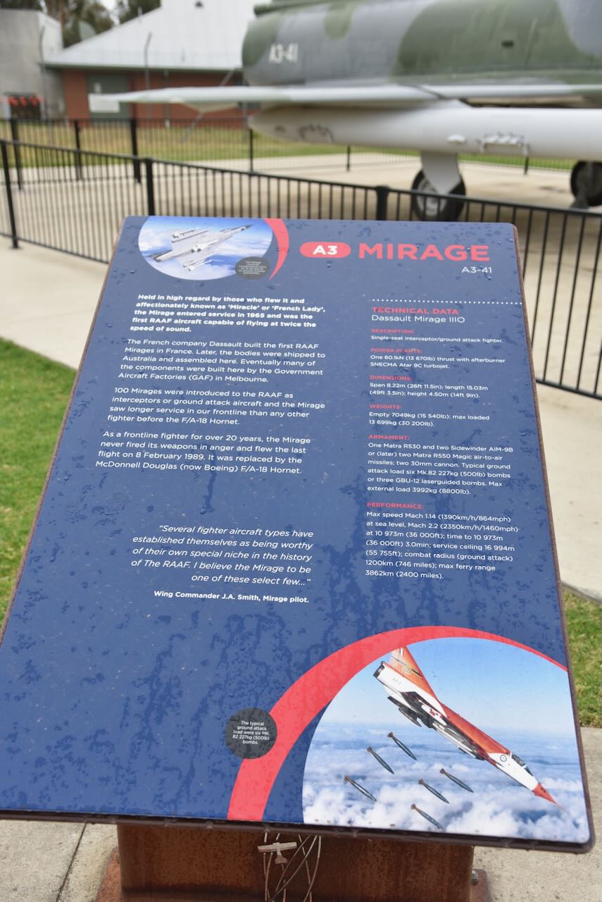 The aircraft on display, Mirage A3-41, was delivered to the RAAF on the 4th day of August 1966 and served with Nos 75, 76, and 77 Squadrons. It caught fire on the 6th day of April 1976 and was forced to make an emergency landing in Nowra, New South Wales. In April 1977, the RAAF School of Technical Training received approval to rebuild the aircraft. (Air Force 2023)