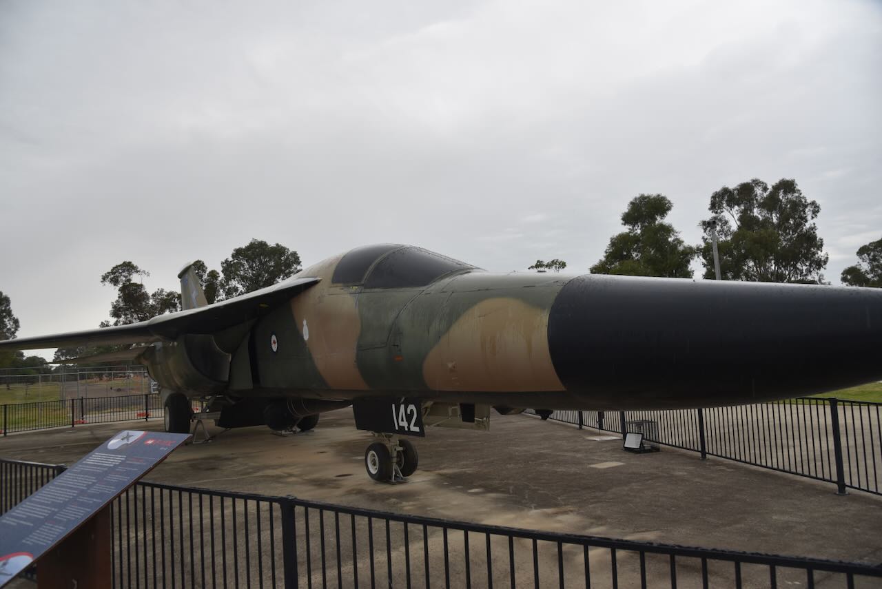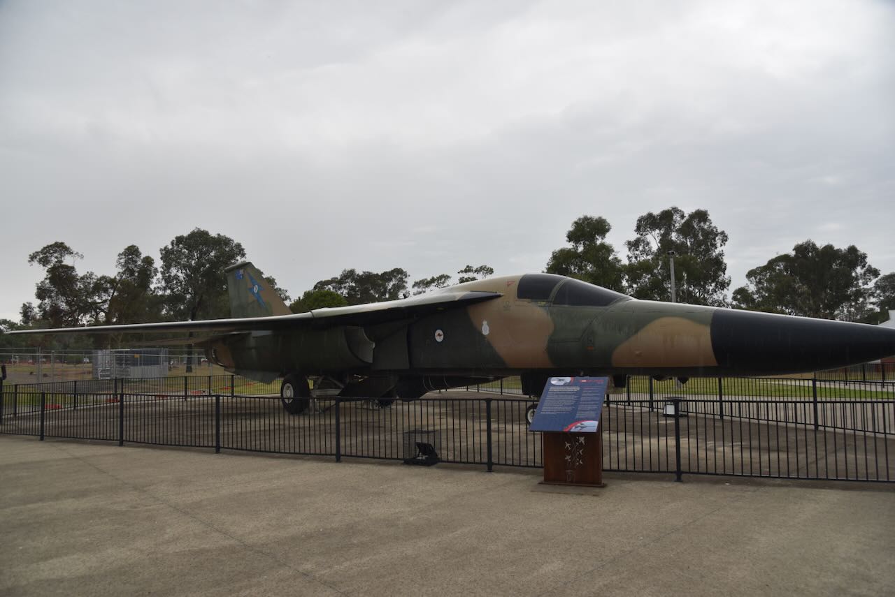 The F-111 on display is F-111 A8-142, which first flew on the 18th day of December 1968. It arrived in Australia on the 1st day of October 1973. It retired in 2010. (Air Force 2023)
