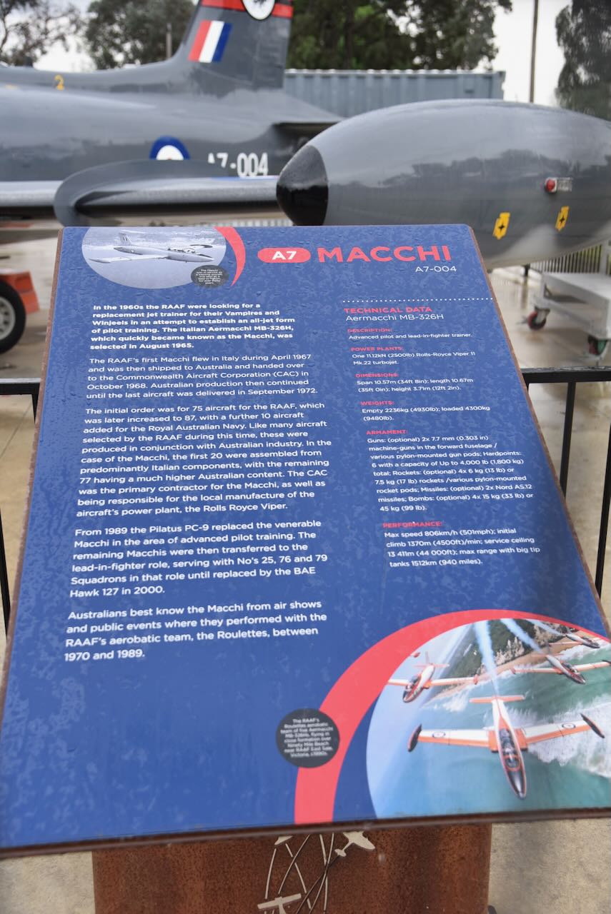 Another aircraft on display is an Aermacchi MB-326H (Machi). These were selected by the RAAF in 1965 as a replacement for the Vampire trainer in 1965. (Air Force 2023)