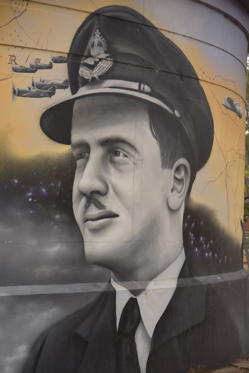 The museum also features a painted water tank. It is the work of artist Sam Brooks. The art features Norman Parry who was a famed pilot and instructor. You can also find a Tigermoth aircraft which was used as a training aircraft. Another person featured is Bill Newtown, a Victoria Cross recipient. (Australiansiloarttrail.com, 2025)