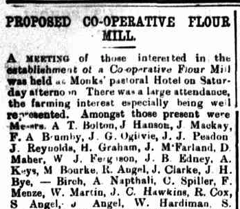 On the 16th day of February 1889, a meeting was held at Monk’s Pastoral Hotel to discuss the establishment of a Co-operative Flour Mill. In August 1889, a general meeting of shareholders was held. A ballot resulted in the election of six gentlemen as directors to manage the Murrumbidgee Co-operative Milling business. (Trove 2025)