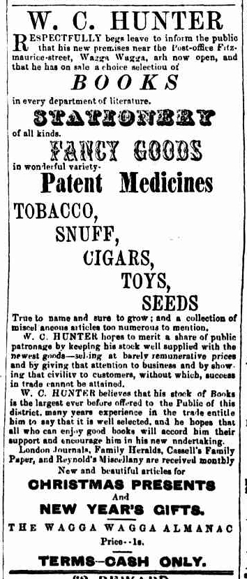 Above: 1866 advertisement for W.C. Hunter’s store. Image c/o Trove