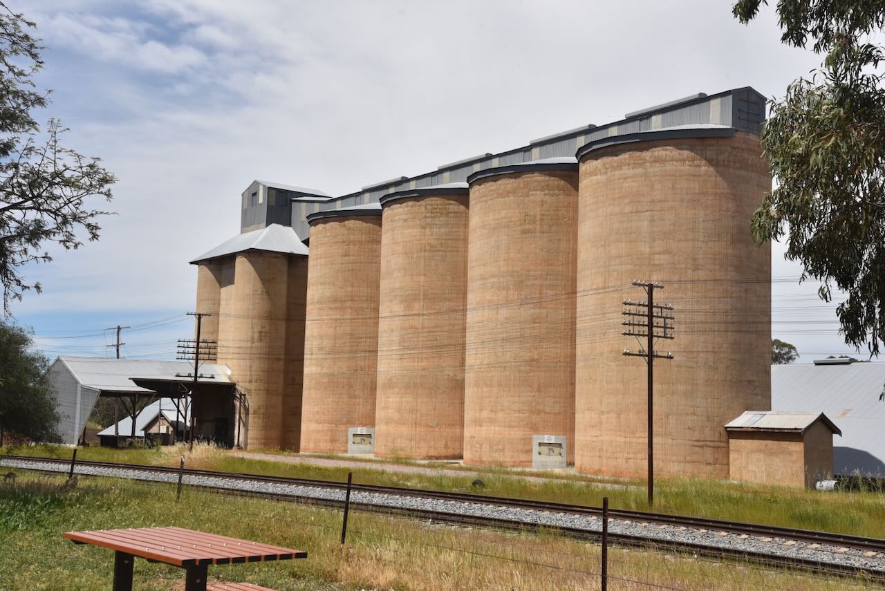 The Marinna silo is located alongside the Main South Railway line, on the southern side of the Olympic Highway.