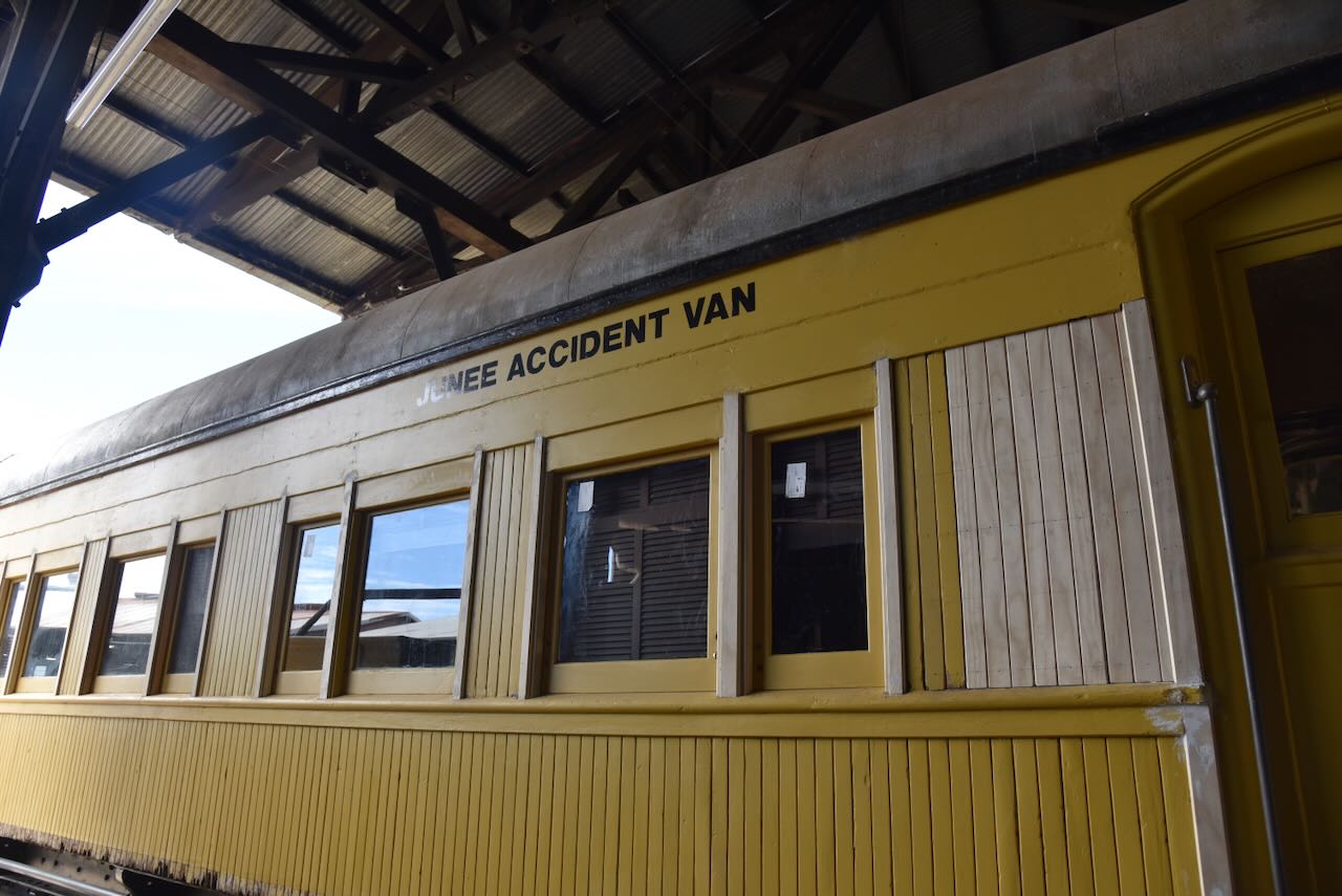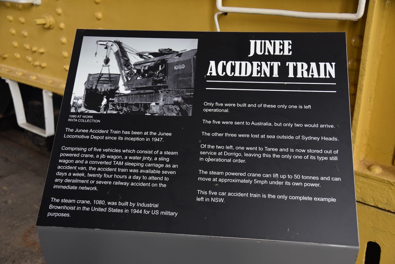 The Junee Accident Train has been at the Junee depot since its opening in 1947. It comprises five vehicles: a steam-powered crane, a jib wagon, a watery jinty, a sling wagon, and a converted TAM sleeping carriage as an accident van. The accident train was available 24/7 to attend to any derailment or railway accident. The steam crane is one of only five that were built, and of those, only this one at Junee is operational.