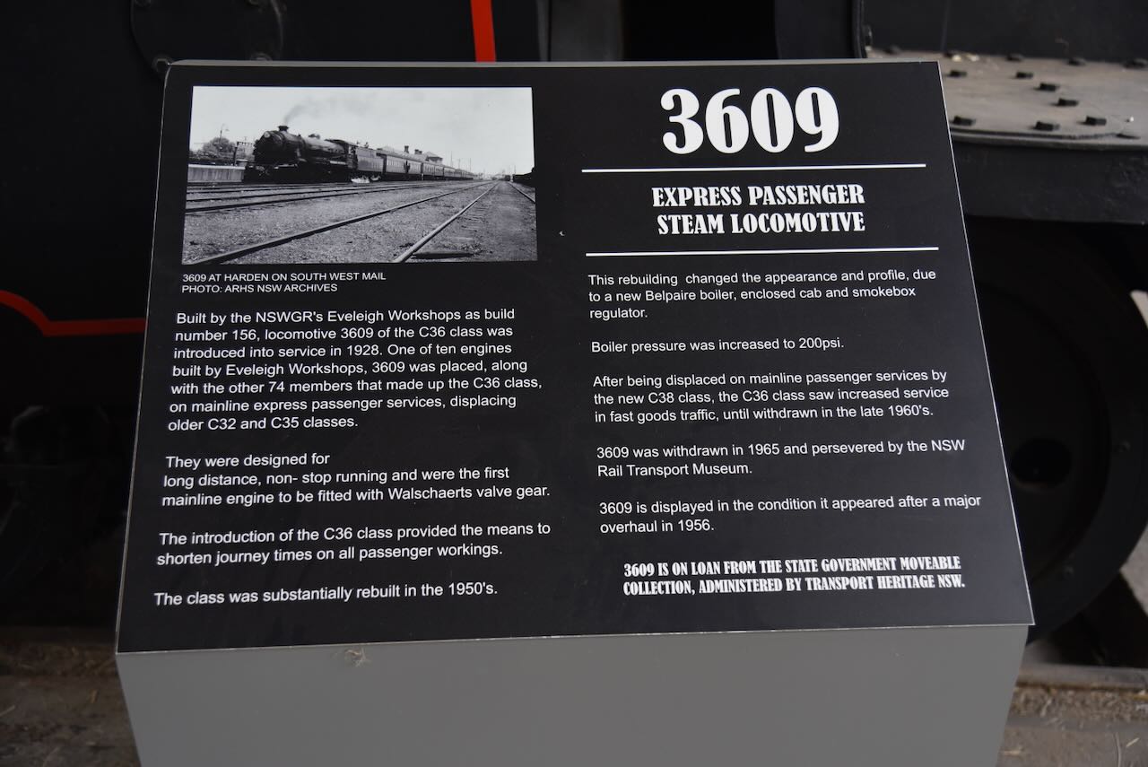 Locomotive 3609 is a C36 class that was introduced into service in 1928. It was built by the NSWGR’s Eveleigh Workshops. It was withdrawn from service in 1965.