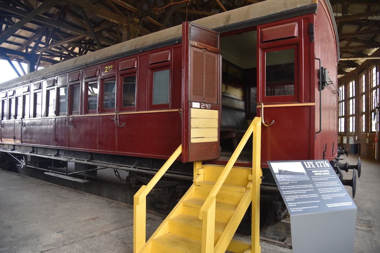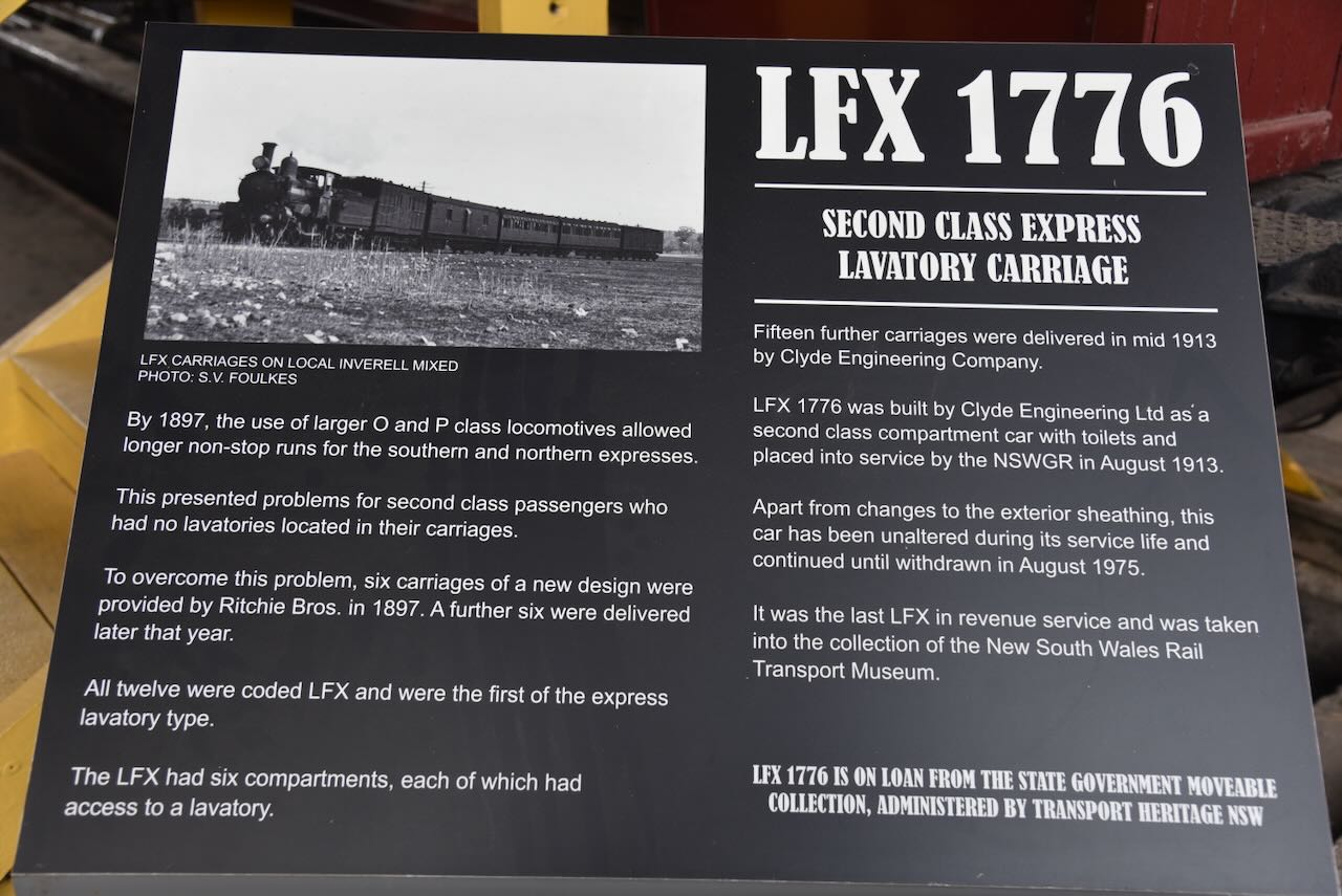 The LFX 1776 Second Class Express Lavatory Carriage was built by Clyde Engineering Ltd in 1913. It had six compartments, each of which had access to a lavatory.