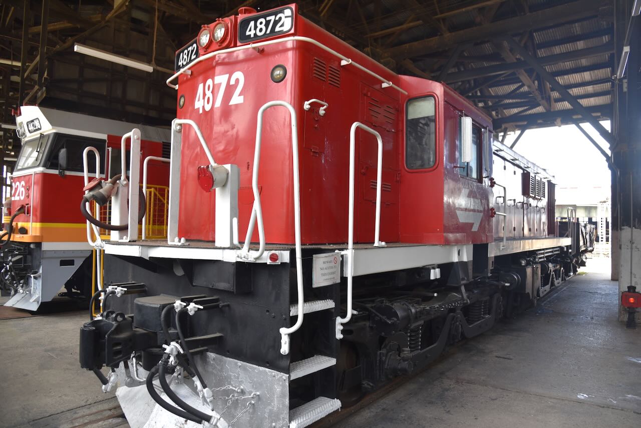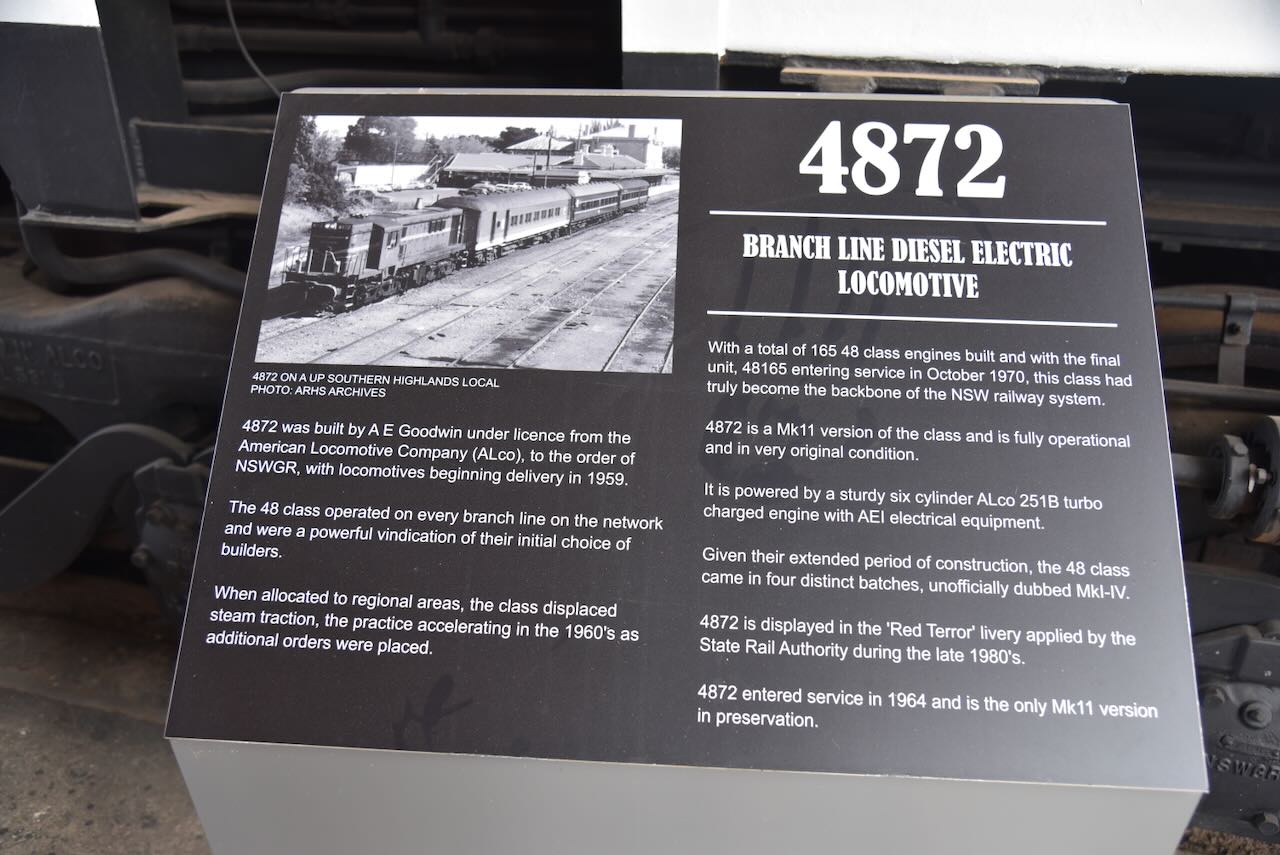 Branch Line diesel electric locomotive 4872 was built by A.E. Goodwin under licence from the American Locomotive Company. It was delivered in 1959. Locomotive 4872 entered service in 1964 and is displayed in the ‘Red Terror’ livery applied by the State Rail Authority during the late 1980s.