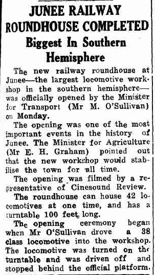The Junee Roundhouse was opened in 1947, and at the time was the largest in the Southern Hemisphere. Construction commenced in 1943. It features 42 repair bays and is still operational. (The Junee Roundhouse Museum n.d.)