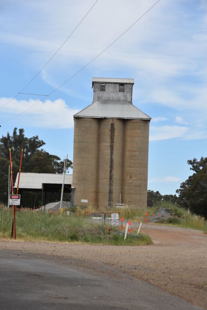 The Marinna silo is located alongside the Main South Railway line, on the southern side of the Olympic Highway.