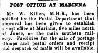 The Boree Siding railway station opened in February 1897. In September 1910, it was renamed Marinna. It closed in 1975. The Marinna Post Office opened on the 7th day of December 1925 and closed in 1968. Marinna is believed to be an Aboriginal word meaning ‘son’. (Nswrail.net 2026) (Wikipedia 2021)
