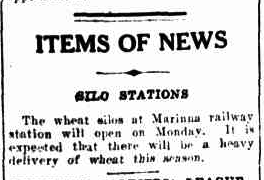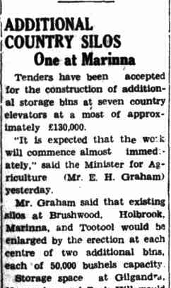 In 1949, it was announced that additional storage bins would be constructed at seven elevators in New South Wales. This included Marinna, where two additional bins, each with a 50,000 bushel capacity, would be constructed. (Trove 2026)