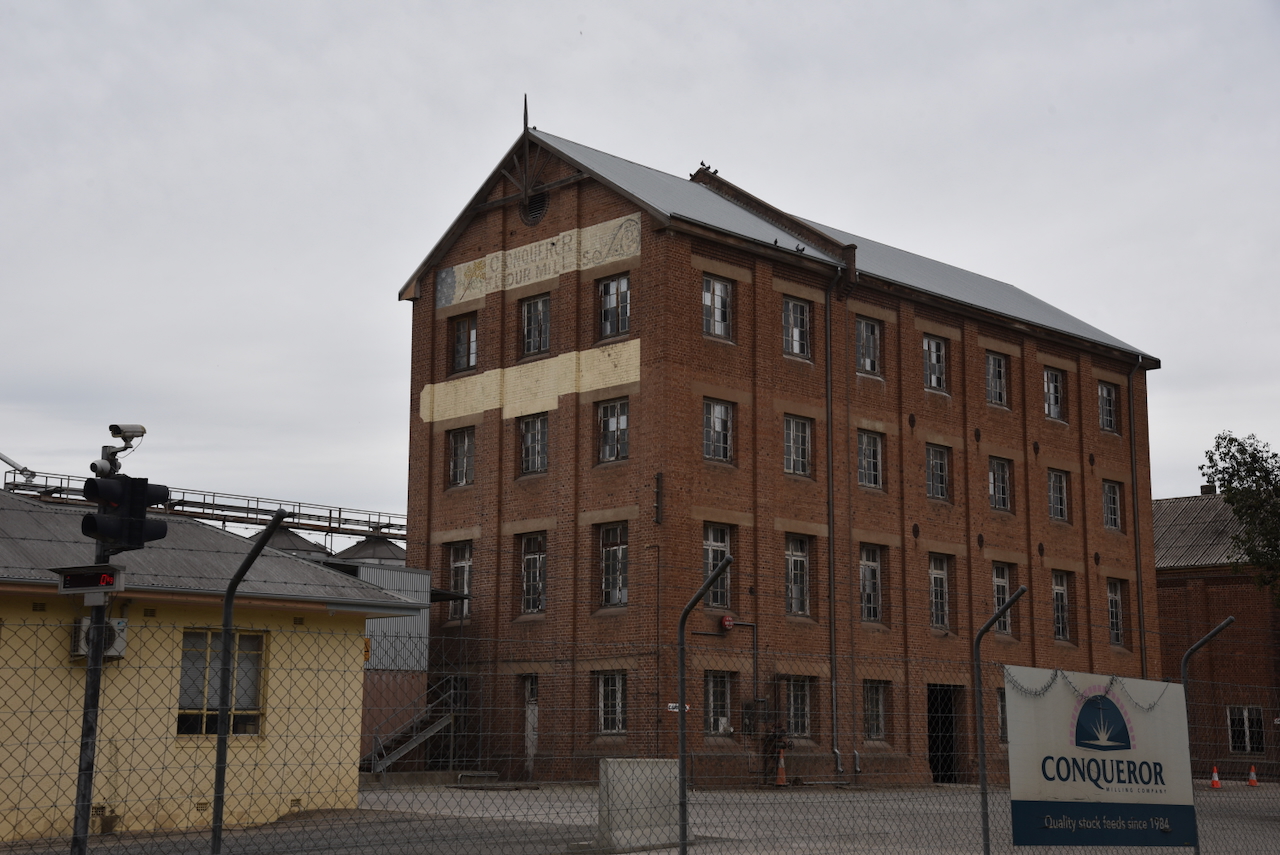 They are located on the site of the historic mill site now run by the Conqueror Milling Company. The mill was built in 1875.