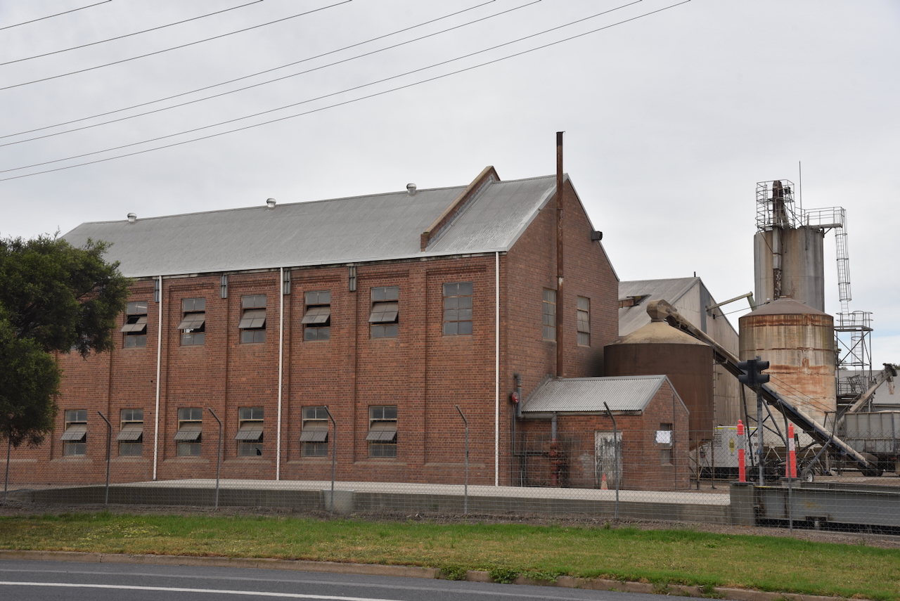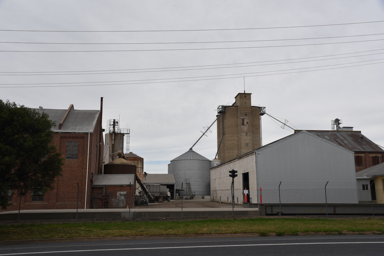 The Cootamundra South silos are located on the southern side of the Olympic Highway, between the highway and the railway line.