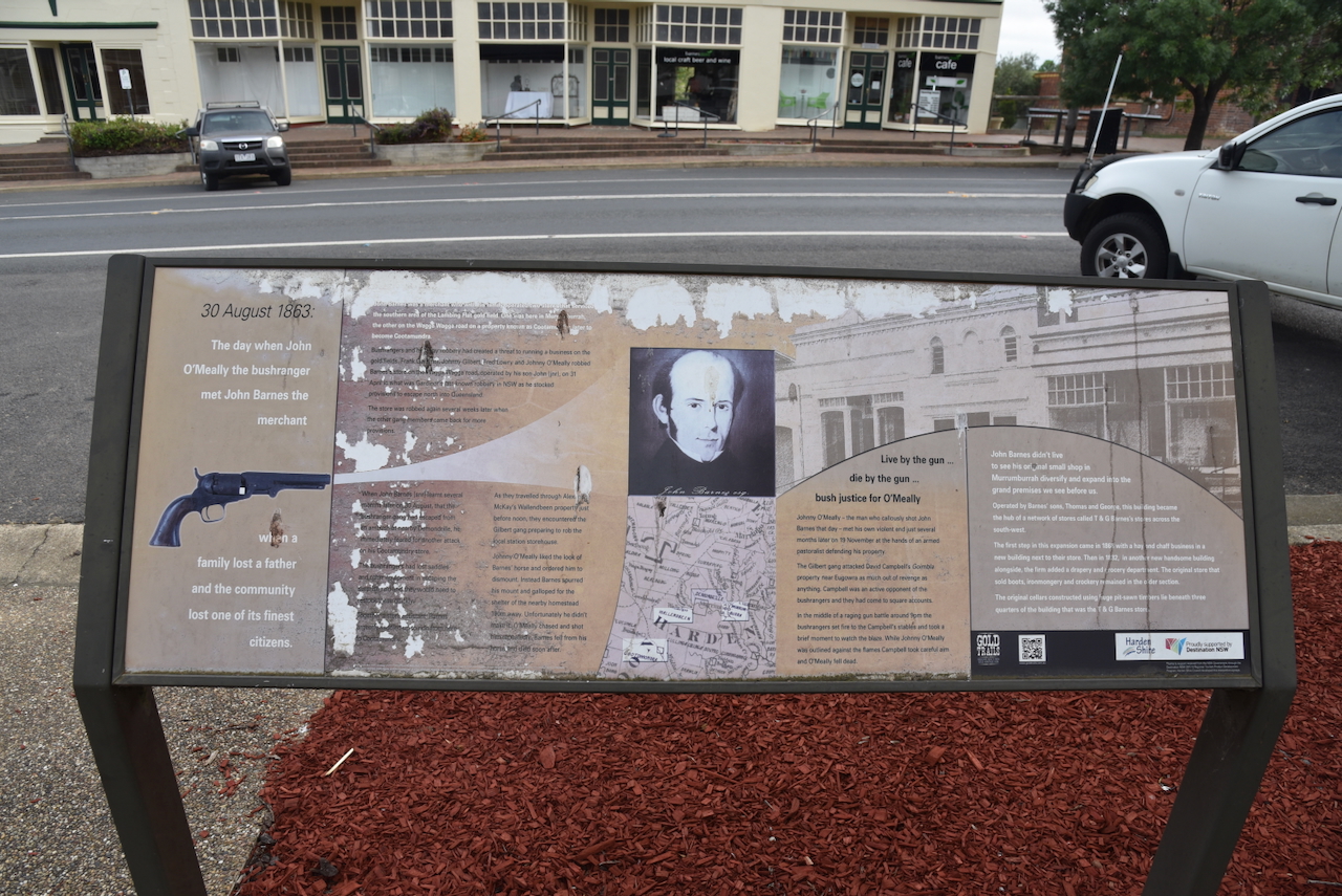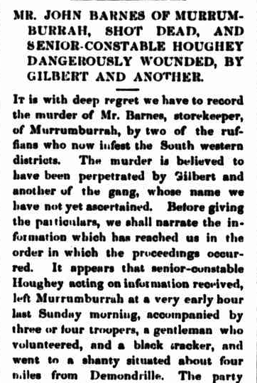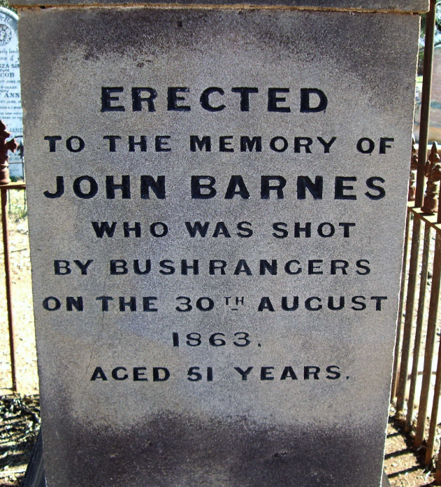 John Barnes was born in June 1812 in Bedfordshire, England. He emigrated to Australia in 1841 aboard the Abbortsford with his wife and family. Barnes was a merchant who owned two stores. One at Murrumburrah and the other on the Wagga Wagga Road on the Cootamundry Run. On the 31st day of April 1863, bushrangers Frank Gardiner, John Gilbert, Fred Lowry and John O’Meally robbed the store at Cootamundry. Several weeks later, the store was robbed again. (ancestry 2016)