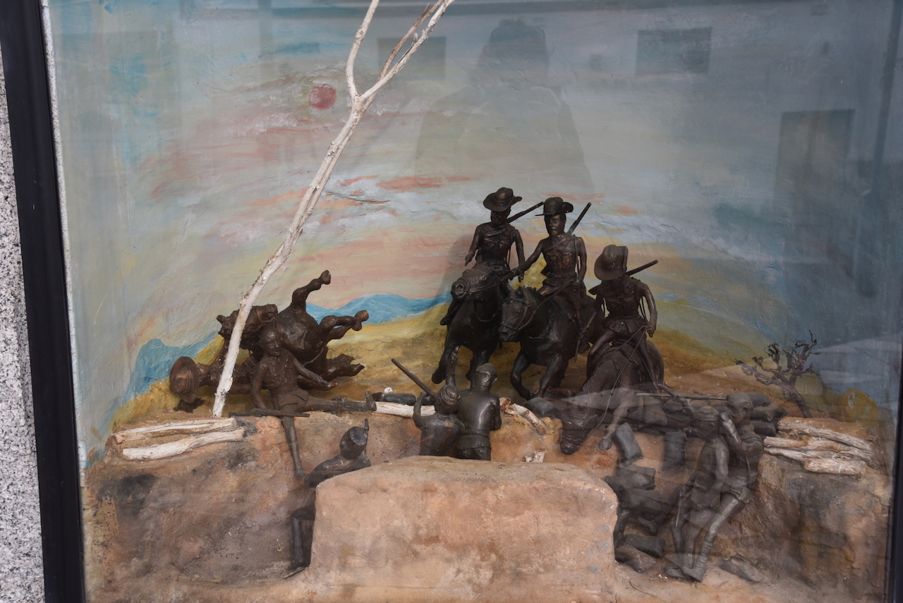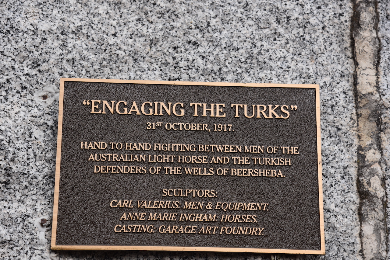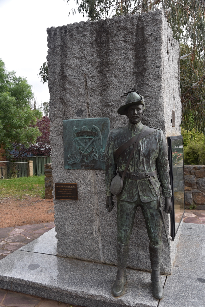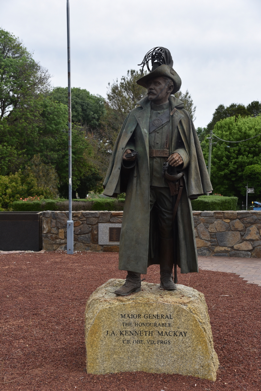 In the main street is a statue of Major-General James Alexander Kenneth Mackay C.B., O.B.E., V.D., F.R.G.S. He created the First Australian Light Horse troop. (Office 2019)