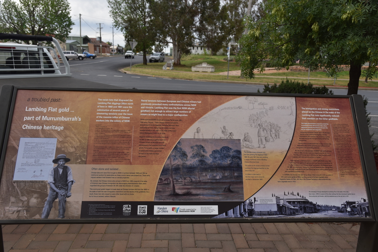 There is also an excellent information board on the Lambing Flat goldfields, about 20 km north. Lambing Flat was the scene of a series of violent anti-Chinese demonstrations that took place in the early 1860s.