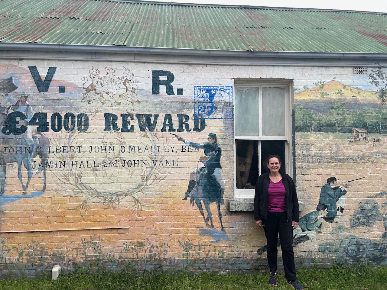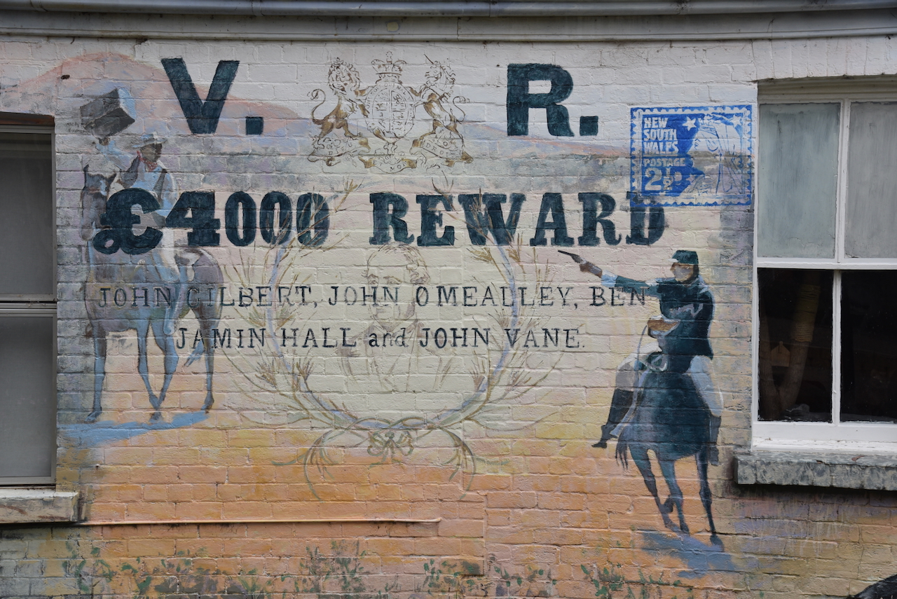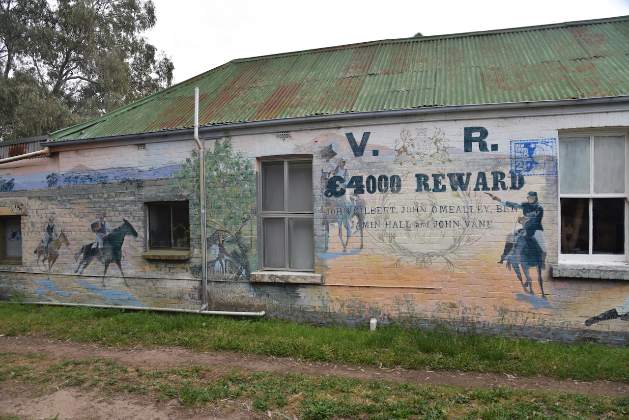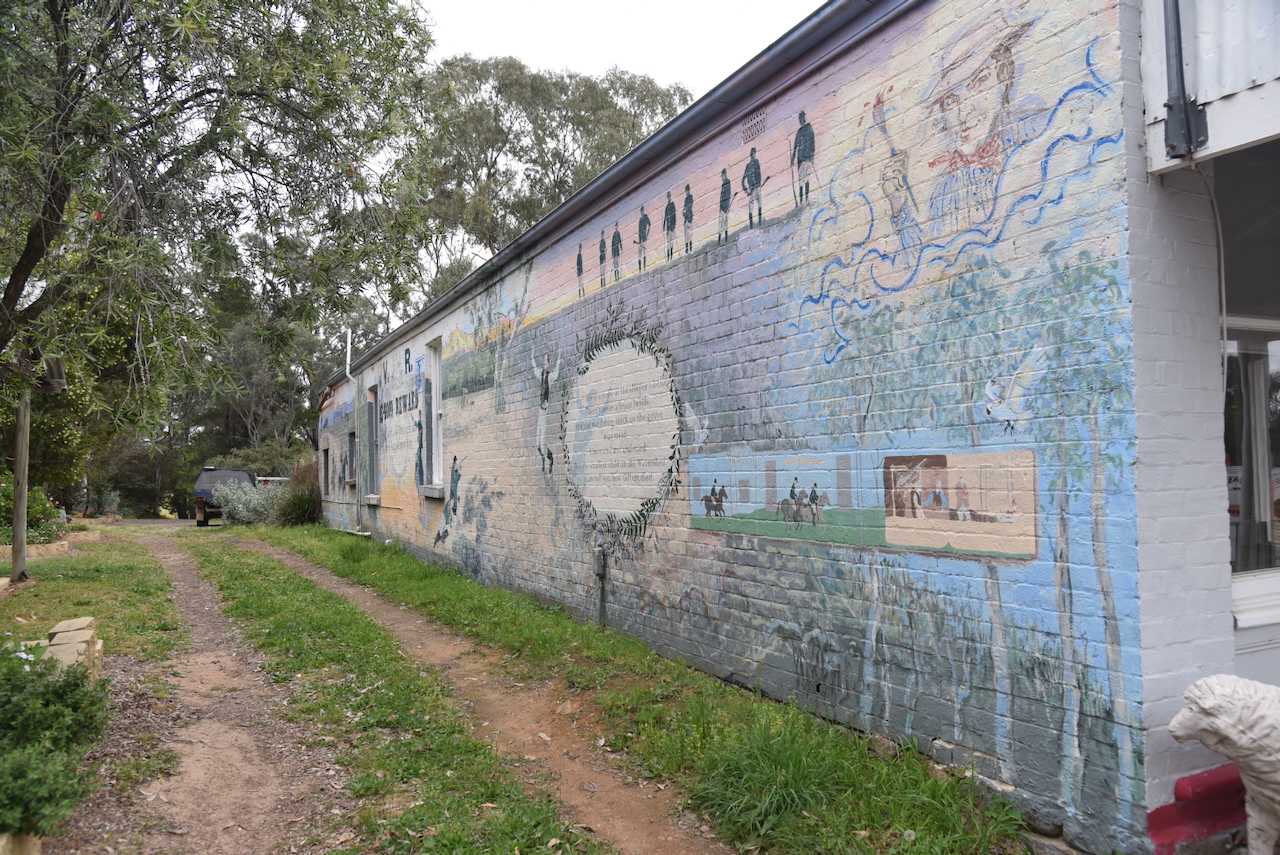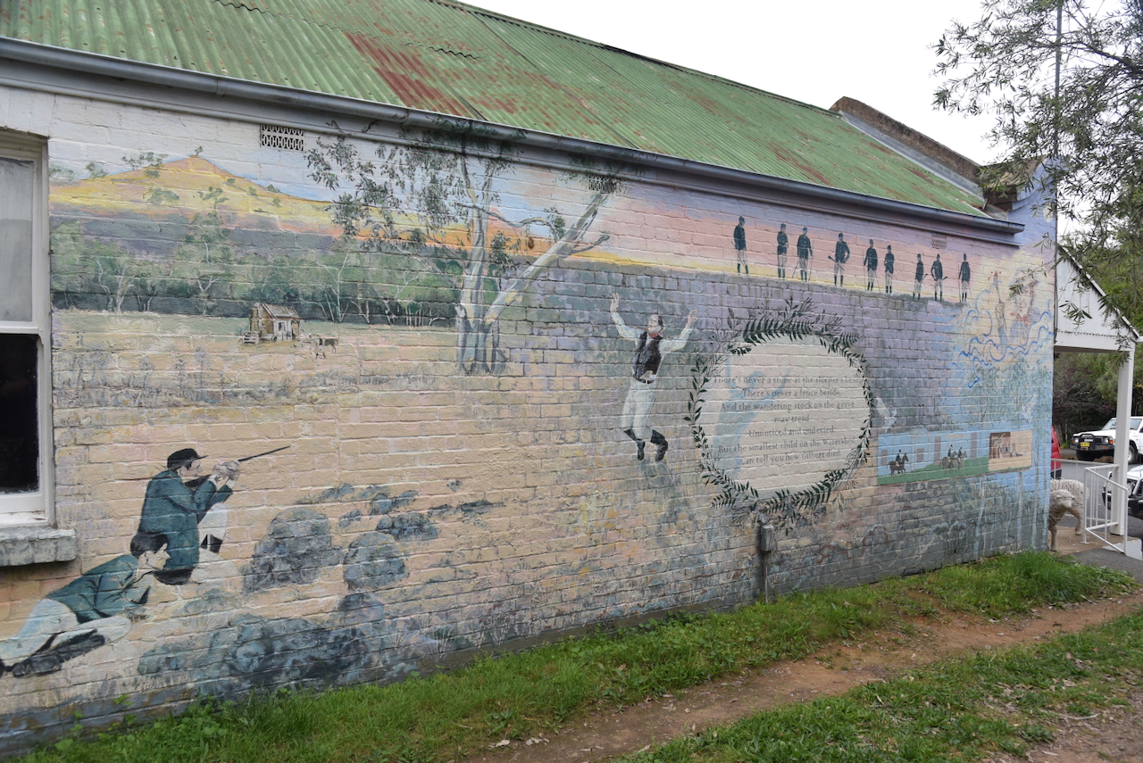 On the side of the old Produce Store in Binalong is an excellent mural on the shooting of John Gilbert.