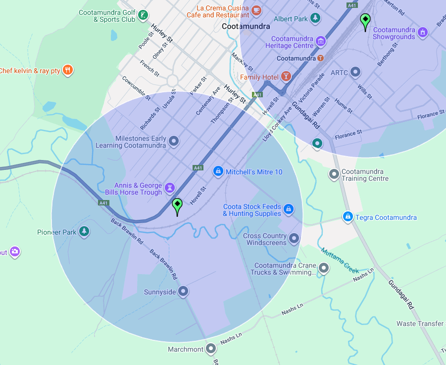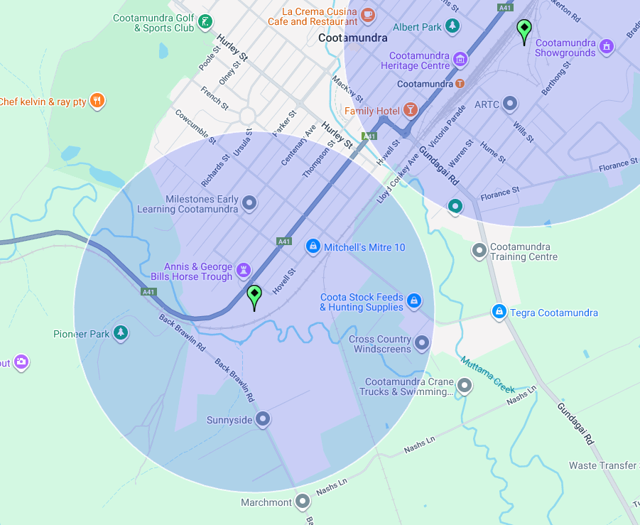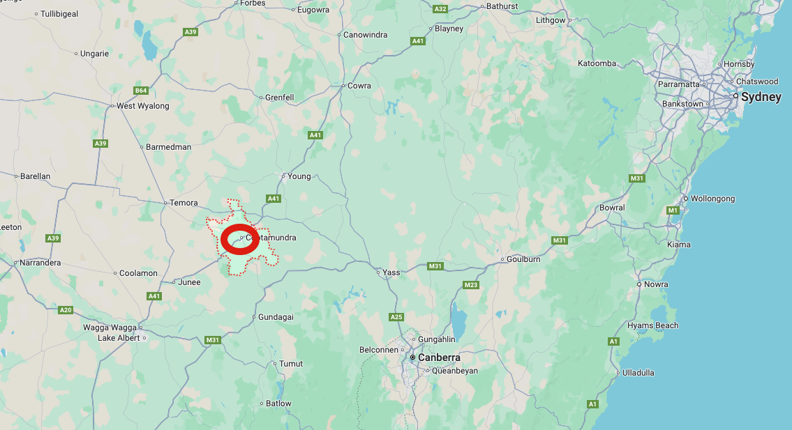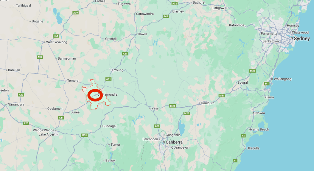 Above: Map showing the location of Cootamundra, NSW. Map c/o Google Maps