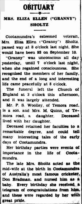 Each birthday, Eliza would receive a telegram of congratulations from Bradman. Eliza died in August 1939, at Cootamundra. She was 92 years old. (Trove 2026)