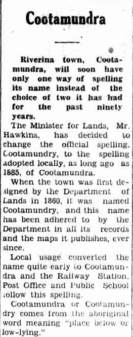 In 1952, it was decided that the town would solely be known as Cootamundra. Mr Hawkins, the Minister for Lands, made the decision to change the official spelling of Cootamundry to Cootamundra, a spelling adopted as far back as 1885. (Trove 2026)