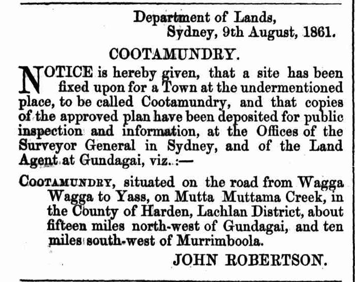 The township of Cootamundry was gazetted on the 9th day of August 1861. Cootamundry was described as “…..situated on the road from Wagga Wagga to Yass, on Mutta Muttama Creek, in the County of Harden, Lachlan District, about fifteen miles north-west of Gundagai, and ten miles south-west of Murrimboola”. (Trove 2026)