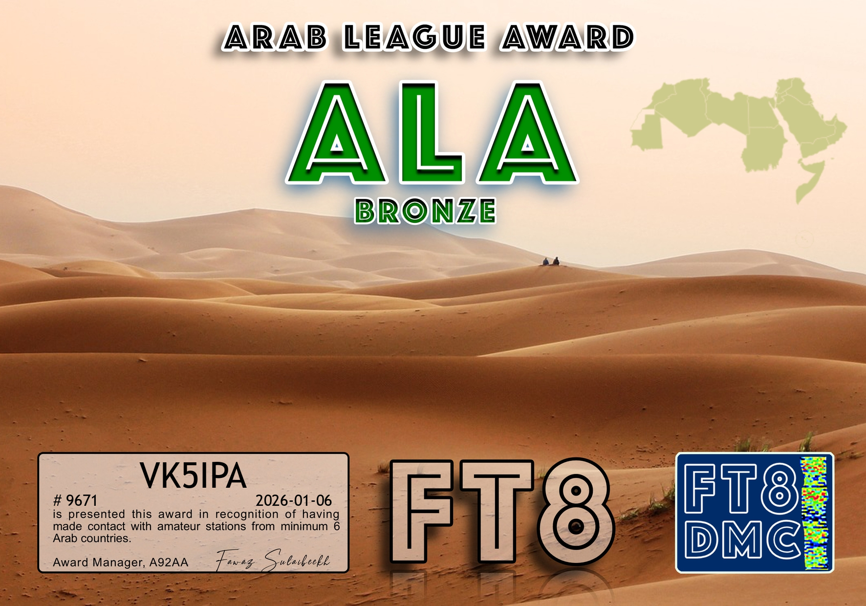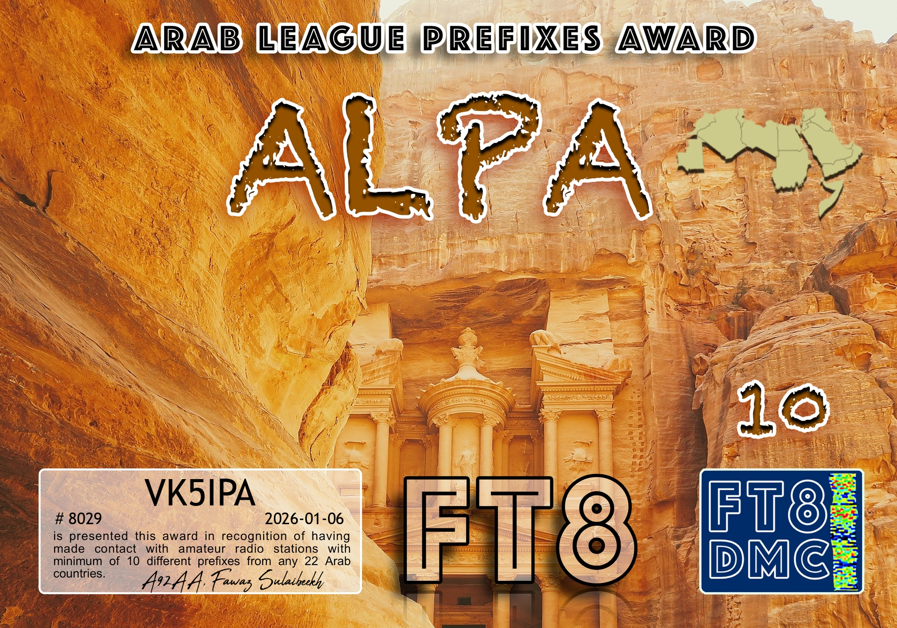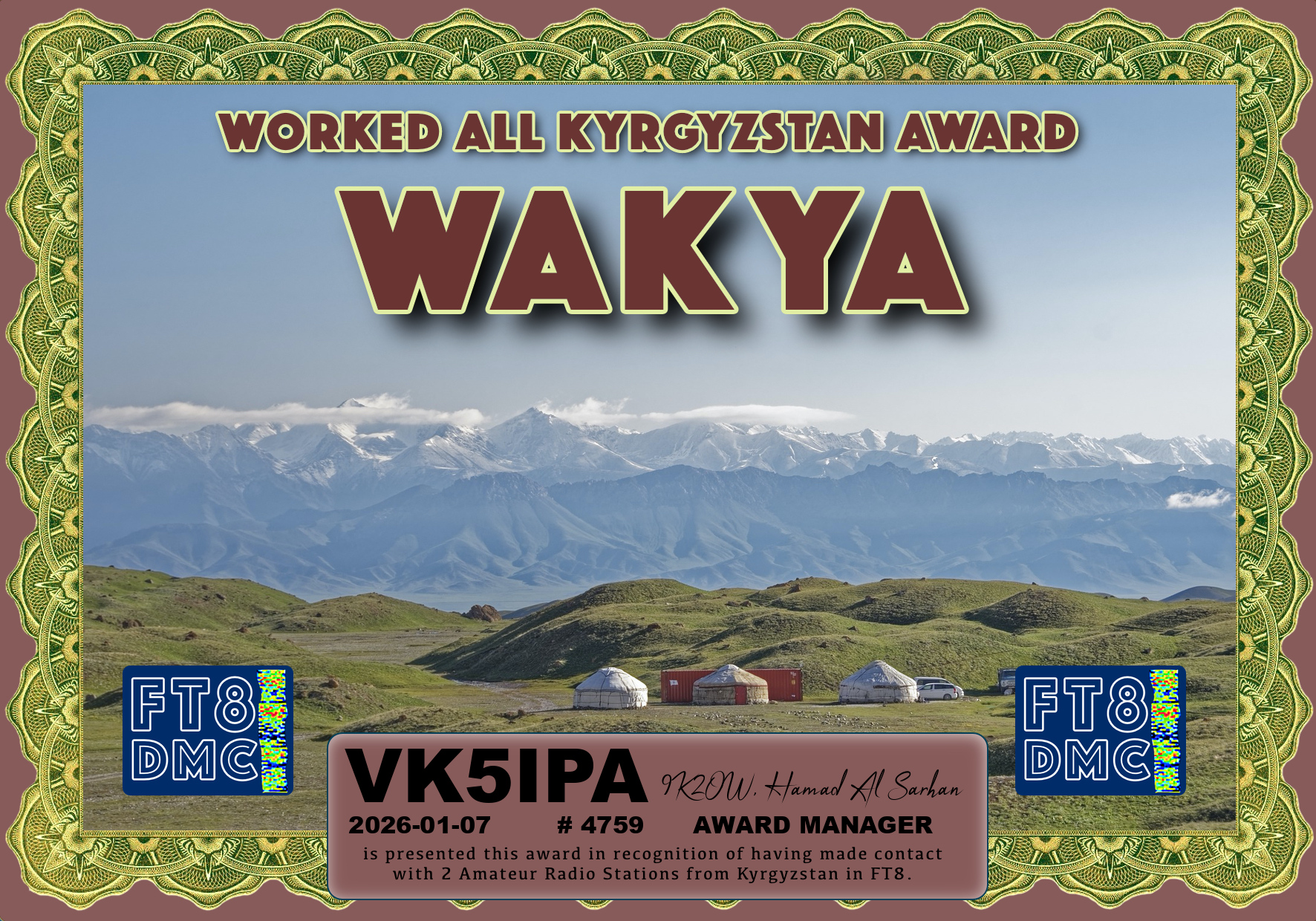 Here are some more FT8 award certificates received for VK5IPA. These are for working stations in Pakistan, Kyrgyzstan, Kazakhstan, Qatar and other countries in the Middle East.
