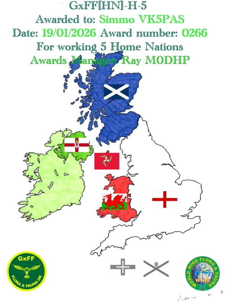 I recently received this certificate via email from the GxFF National program in World Wide Flora Fauna (WWFF) for working 5 Home Nations.