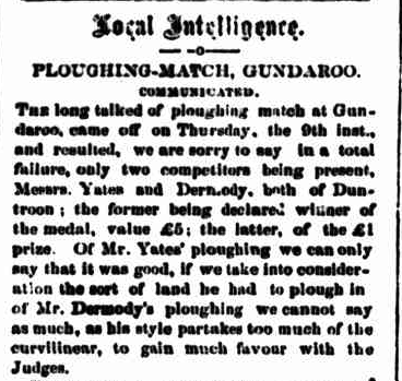 In 1863, a ploughing match was held at Gundaroo, northeast of Canberra. John Darmody and another male called Yates from Duntroon won the event and received a medal.
