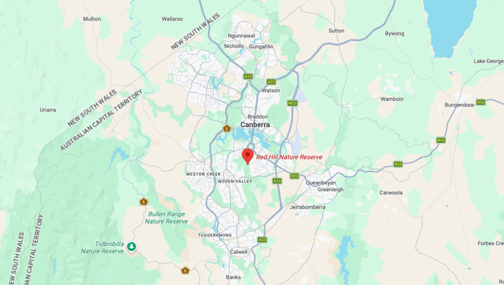 The Red Hill Nature Reserve is about 293 hectares in size and is located on the eastern edge of Woden Valley in Canberra. The reserve includes Davidson Hill, which is 750 metres above sea level, and Red Hill, which is 720 metres above sea level. The reserve is adjacent to the Mount Ainslie Nature Reserve. (and 2023)