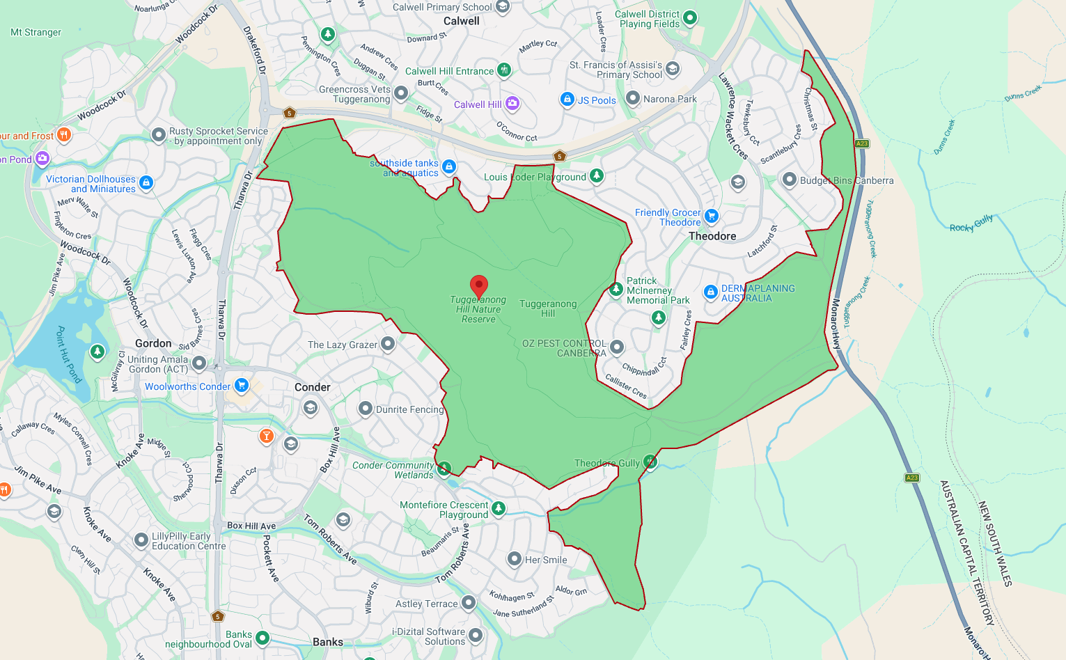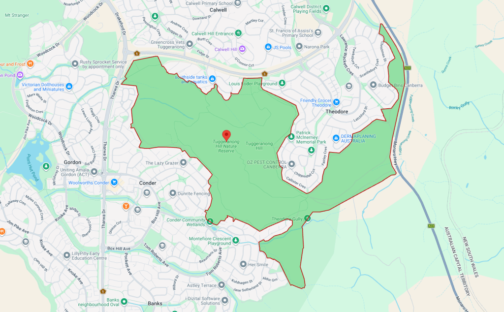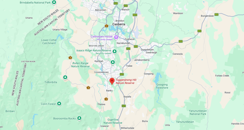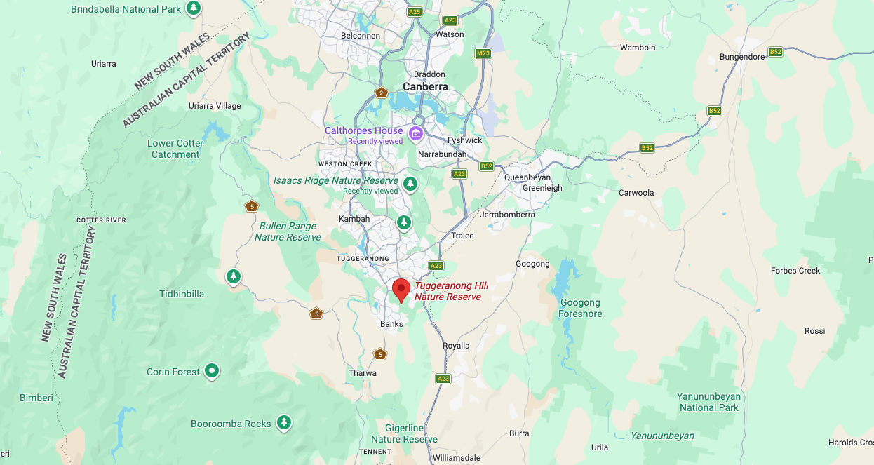 Above:- Map showing the location of the Tuggeranong Hill Nature Reserve. Map c/o Google Maps