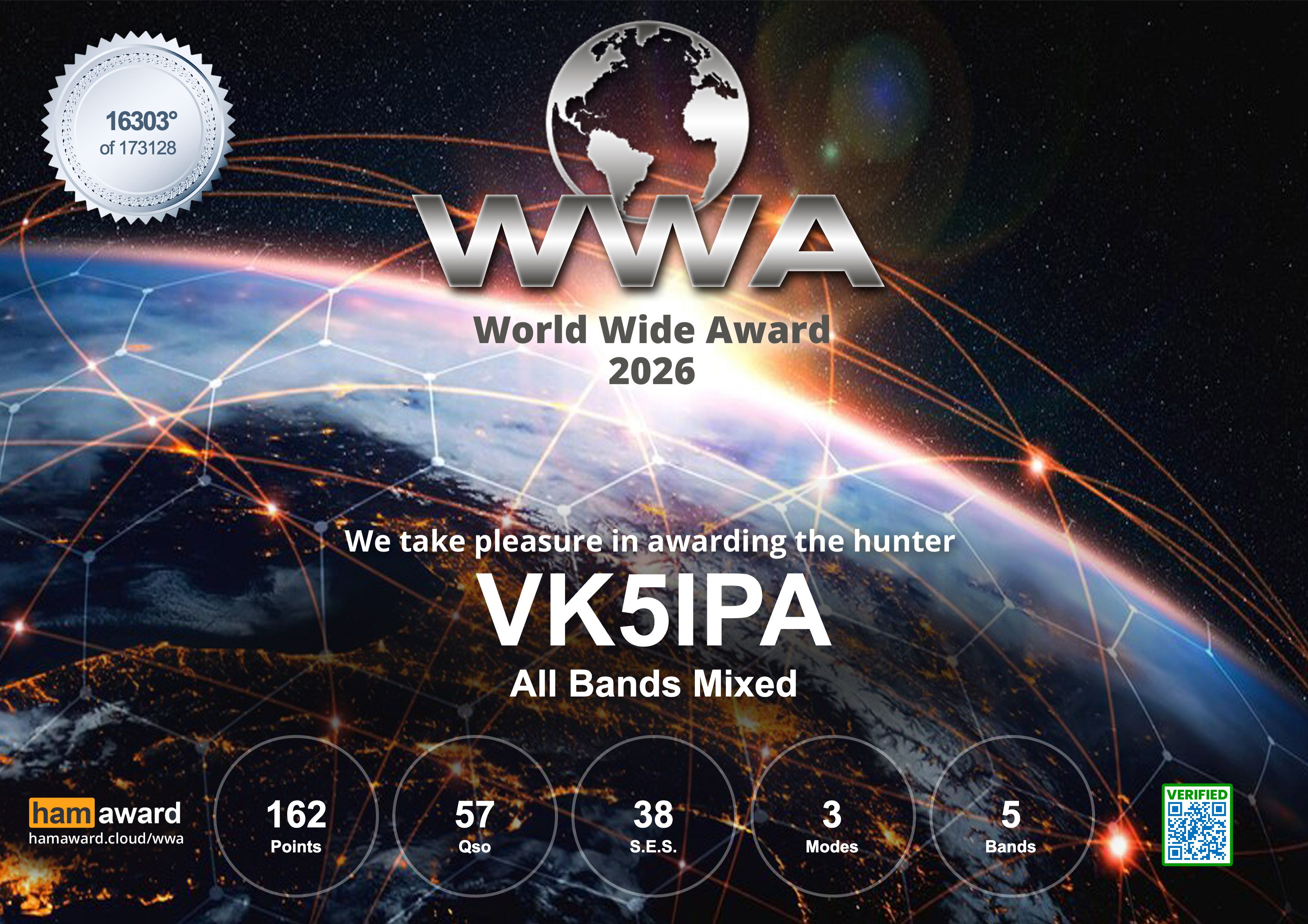 This morning, I downloaded my certificate for VK5IPA for the 2026 World Wide Award (WWA).
