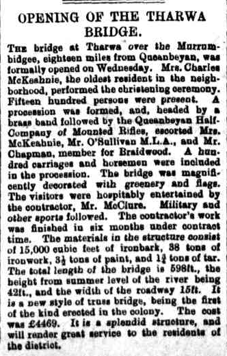 When the bridge was opened in 1895, a public holiday was declared in the region. A parade was held in Tharwa, and about 1,500 people watched the official opening. The oldest resident of the district performed the christening ceremony In 1998, the bridge was entered in the ACT Heritage Register. It is also listed in the National Trust of Australia. (Wikipedia 2021)