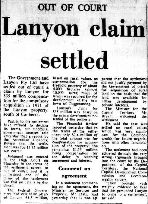 During the late 1960s, large tracts of farming land south of Canberra were resumed to make way for the development of Tuggeranong, the second of Canberra’s urban satellites. The Australian Federal Government proceeded to acquire the Lanyon property, but Field refused an offer of $1.87m. He also sought compensation of $33m, which was the amount placed on the land when assessed by a private valuer. The matter eventually went to the Australian High Court. In 1974, the Federal Government acquired Lanyon for $3.7m in an out-of-court settlement. (Wikipedia 2025)