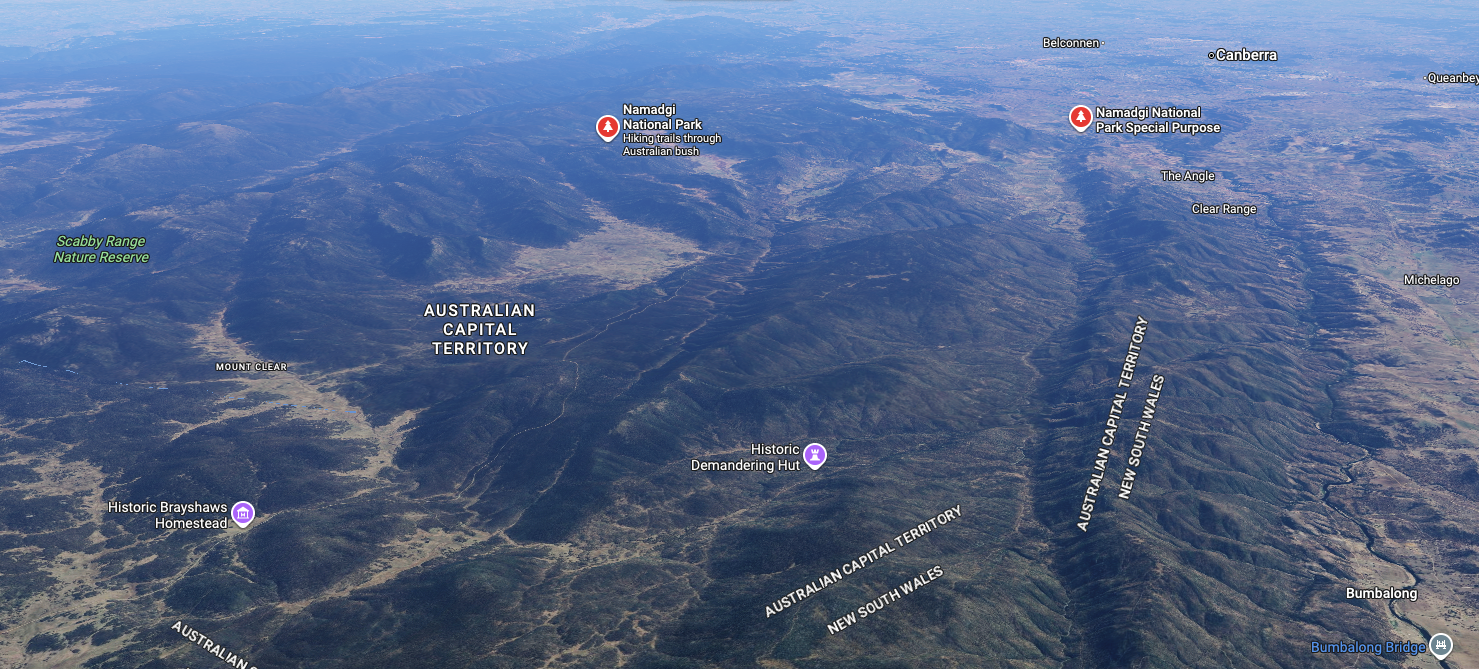 Above: an aerial view of the Namadgi National Park. Image c/o Google Maps
