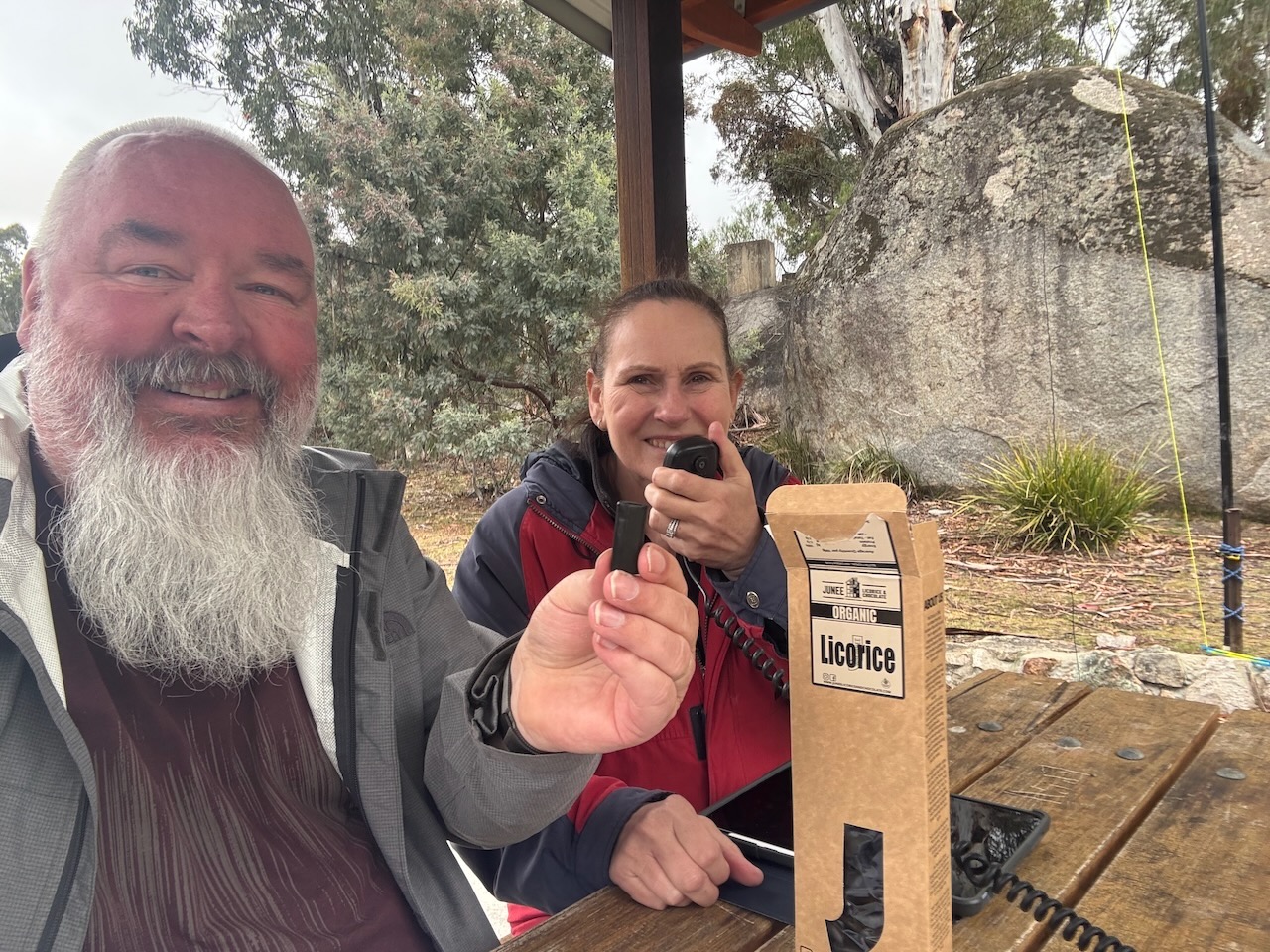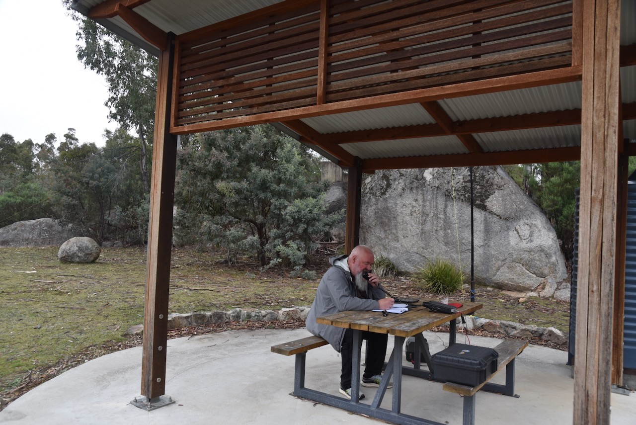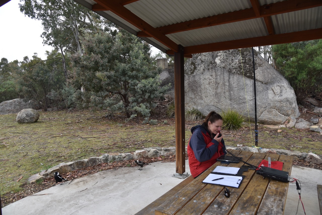 We set up in a small shelter shed, which afforded us some protection from the drizzly rain. Marija and I ran the Yaseu FT857, 40 watts, and the 20/40/80m linked dipole.