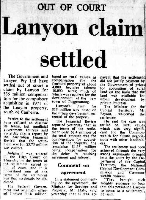 During the late 1960s, large tracts of farming land south of Canberra were resumed to make way for the development of Tuggeranong, the second of Canberra’s urban satellites. The Australian Federal Government proceeded to acquire the Lanyon property, but Field refused an offer of $1.87m. He also sought compensation of $33m, which was the amount placed on the land when assessed by a private valuer. The matter eventually went to the Australian High Court. In 1974, the Federal Government acquired Lanyon for $3.7m in an out-of-court settlement. (Wikipedia 2025)