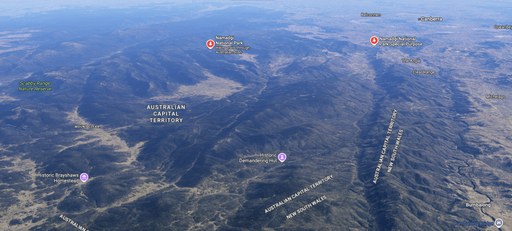 Above: an aerial view of the Namadgi National Park. Image c/o Google Maps