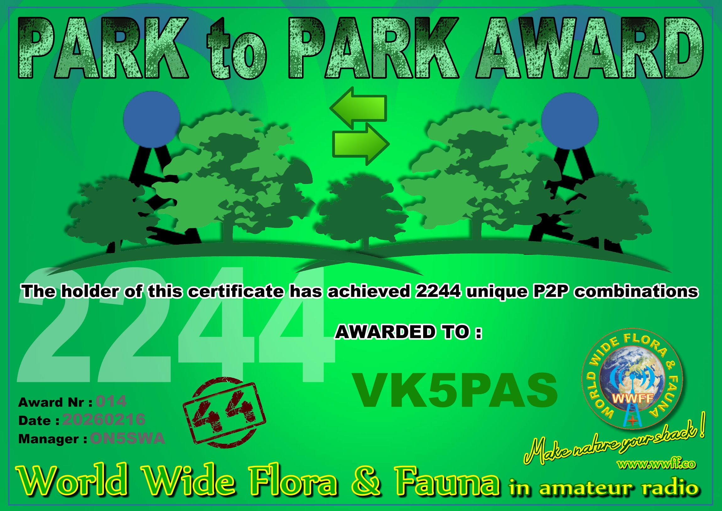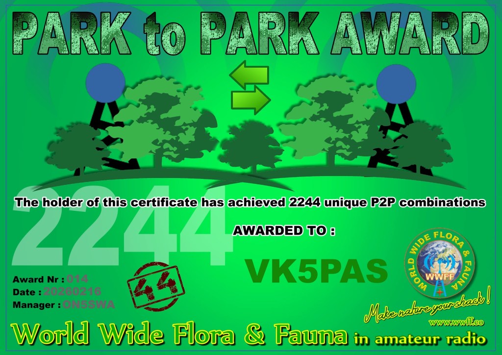 This morning, I received the certificate below for the World Wide Flora Fauna (WWFF) program. It is the Park to Park Award, issued for having made a total of 2,244 Park to Park contacts.