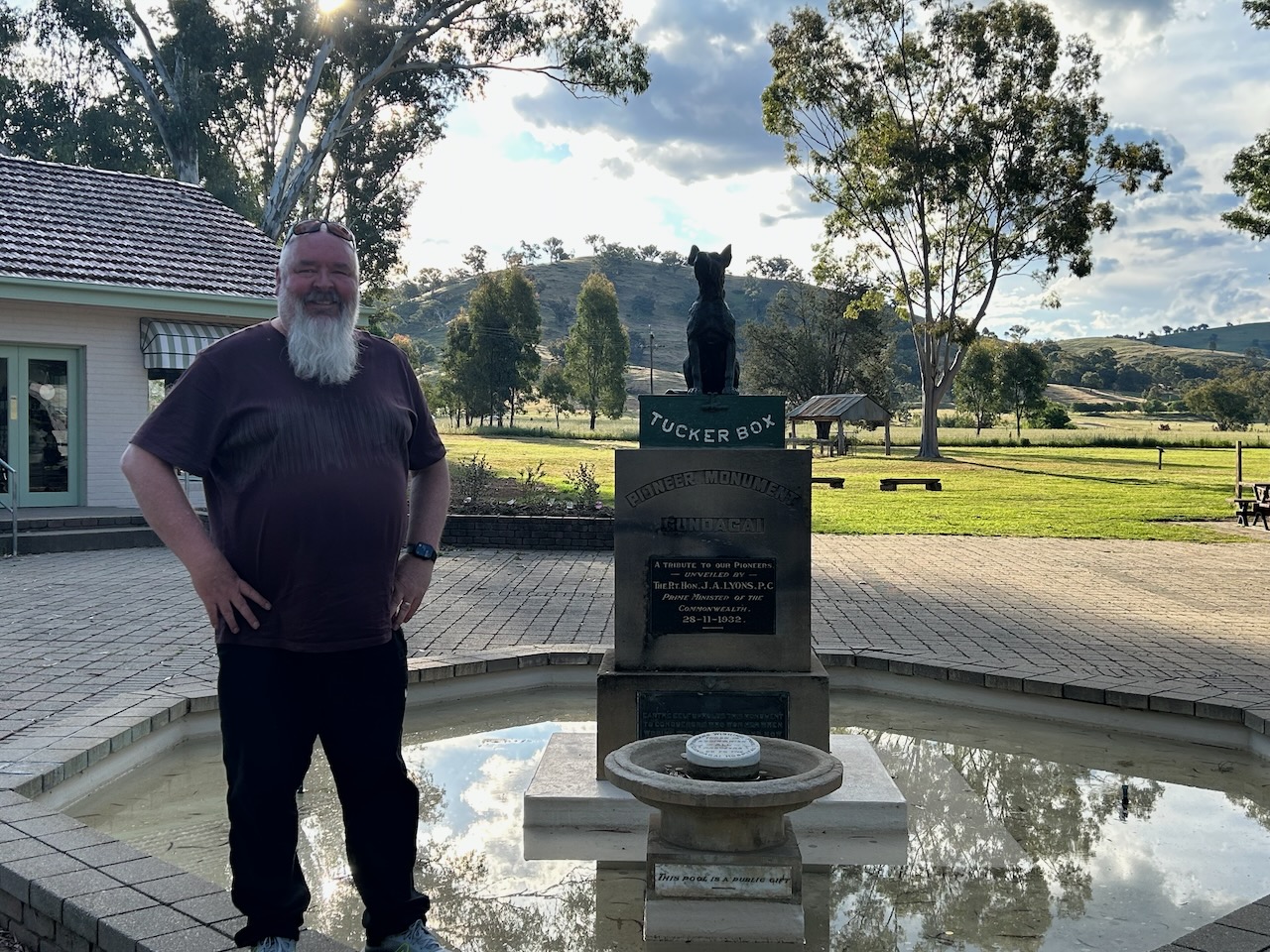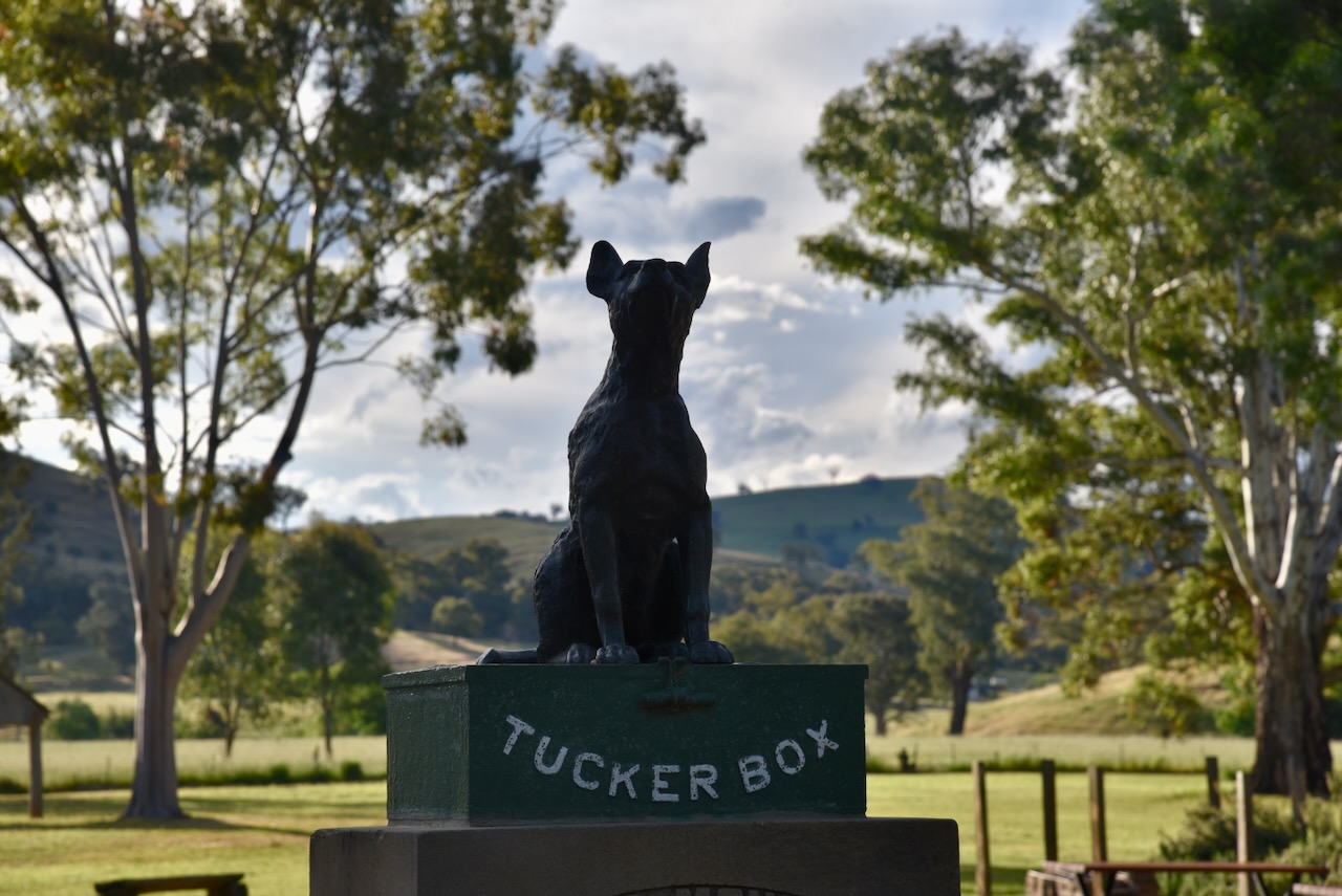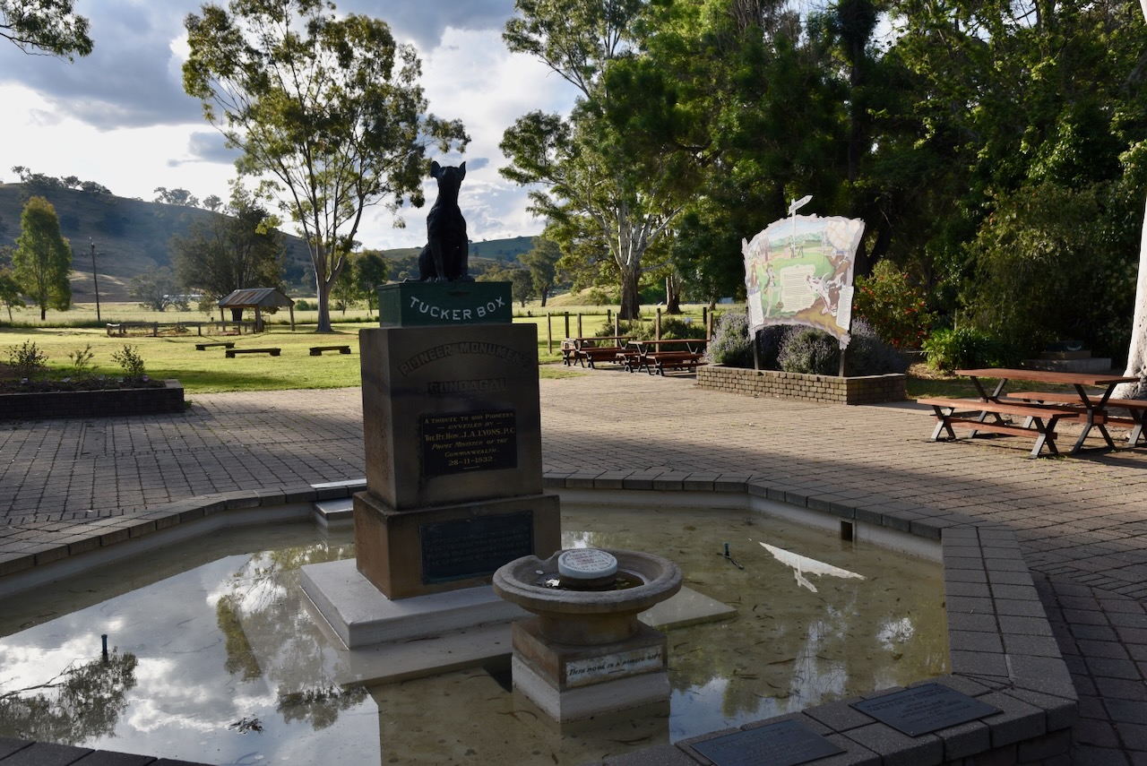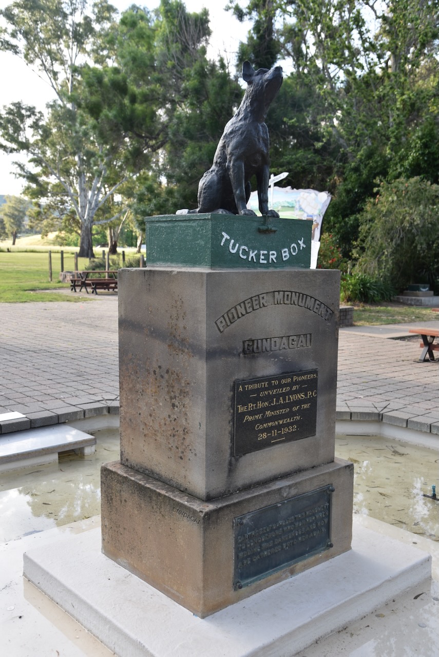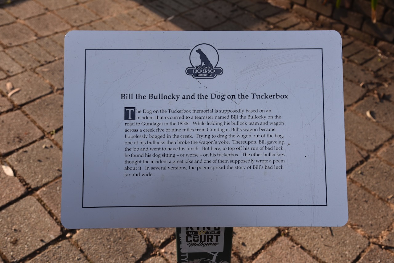 The inspiration behind the monument is the poem entitled ‘Bill, the Bullocky’, which was published in 1857. The poem describes a series of misfortunes faced by a bullock driver, which culminated in his dog sitting on the food in his tucker box. For those reading this from overseas, a tuckerbox is an Australian name for a box that holds food. A tucker box is similar to a lunchbox, but is larger in size. (Wikipedia 2026)