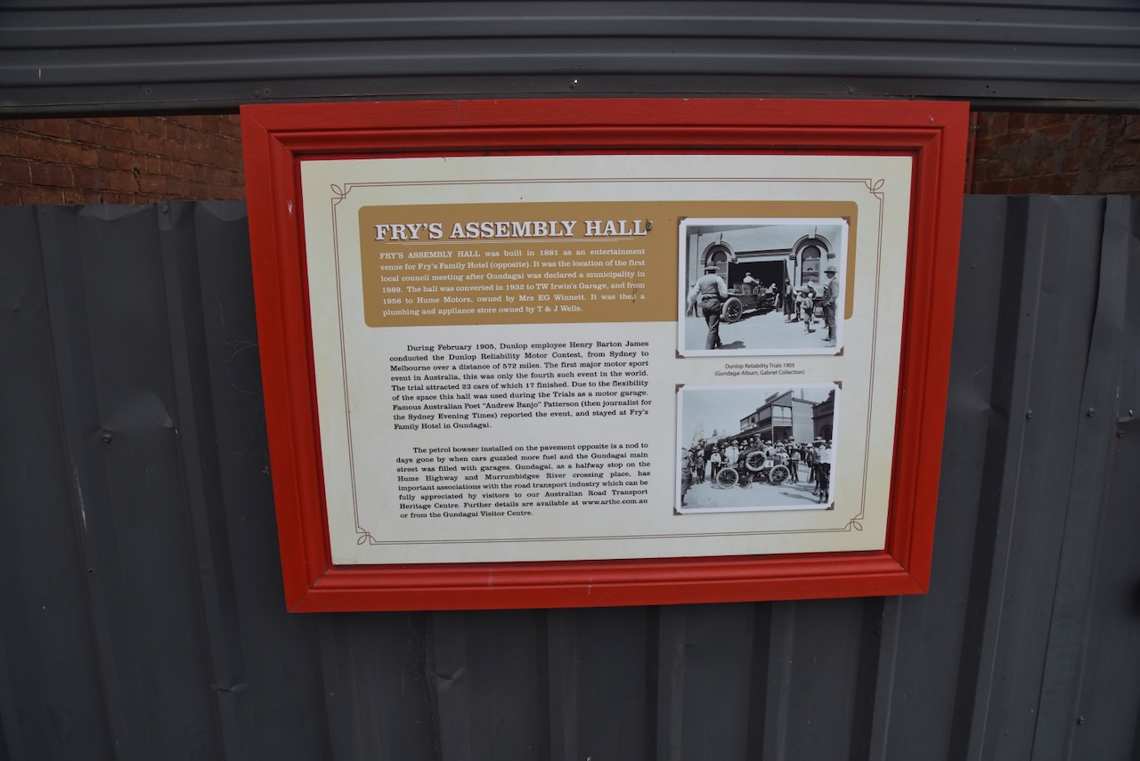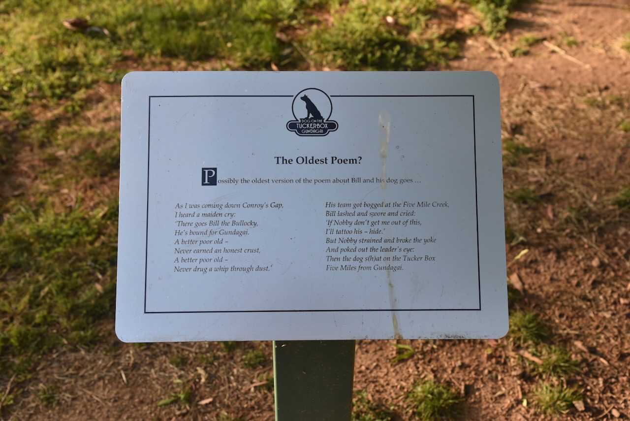 At the site, some signs describe the history of the Dog On The Tuckerbox and also show the words to both Bill the Bullocky and Nine Miles from Gundagai.
