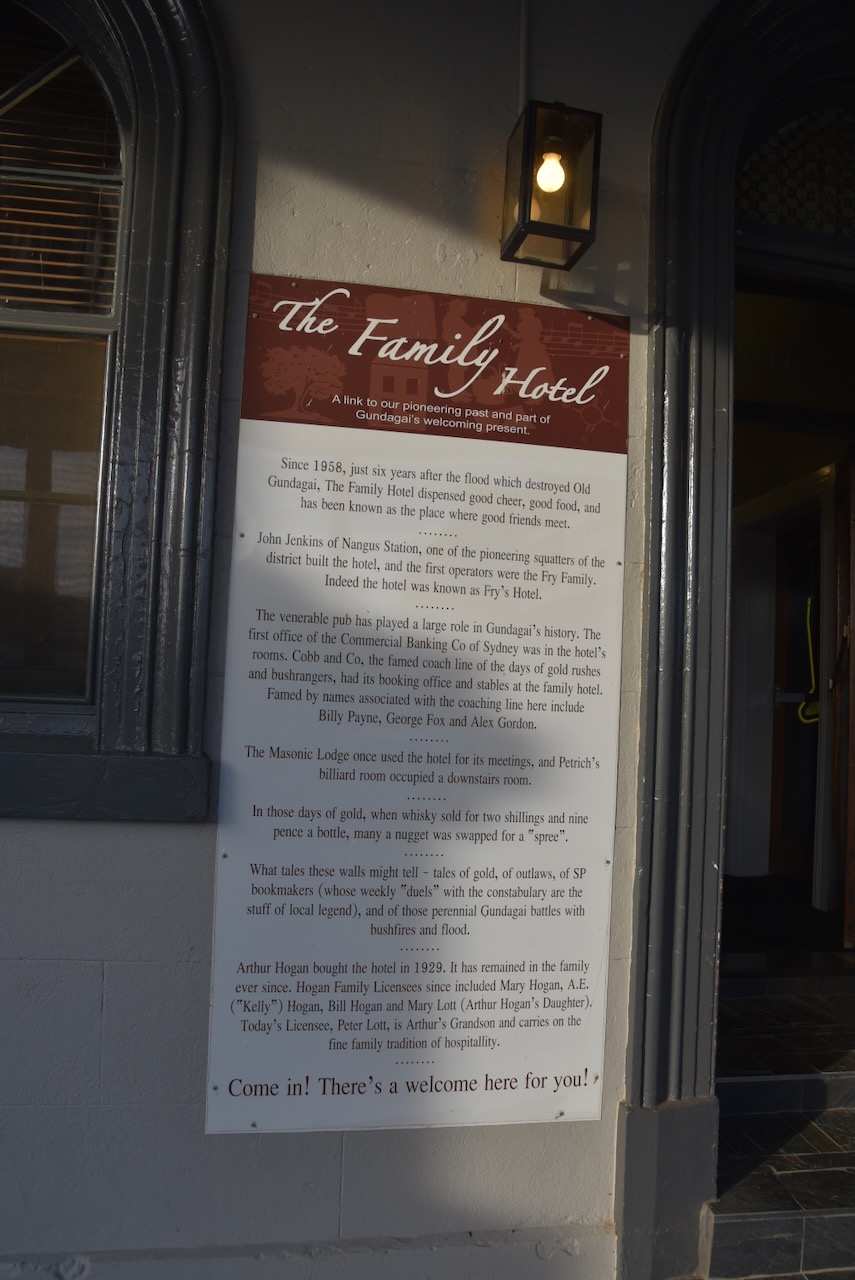 The Family Hotel was originally John Spencer’s Thatched Cottage in South Gundagai, and was first licensed in 1843. In 1848, Spencer renewed the license under the name of the Gundagai Family Hotel. It acted as a Cobb & Co booking agent. (Burch 2022)
